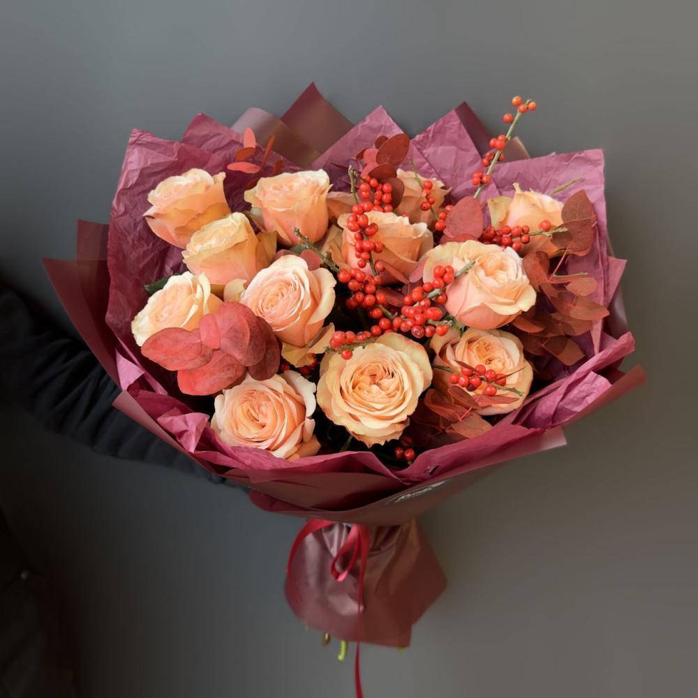 Букет с пионовидной розой Kahala и илексом! Доставляется в транспортировочной коробке