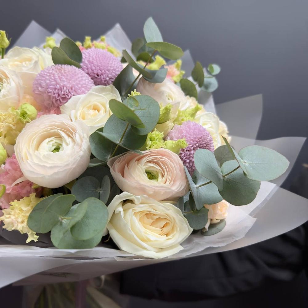Букет с нежнейшими ранункулюсами и хризантемой Момоко Доставляется в транспортировочной коробке