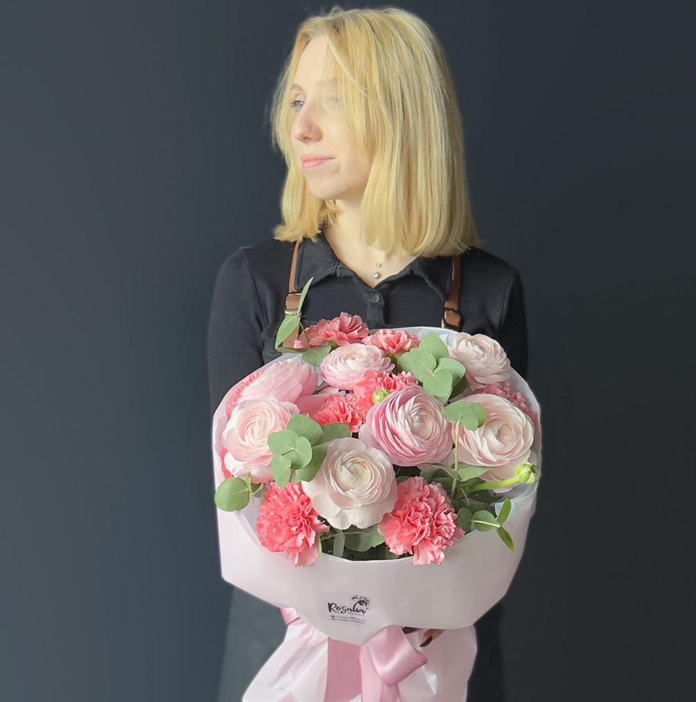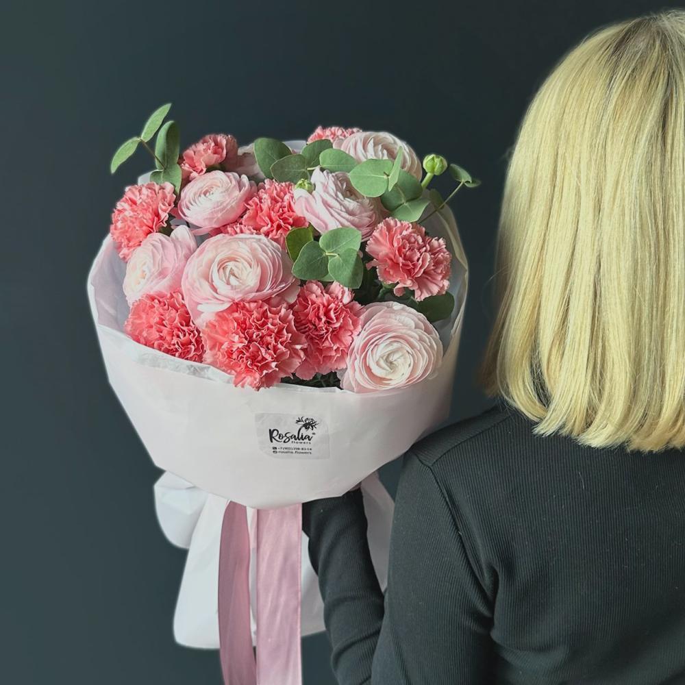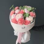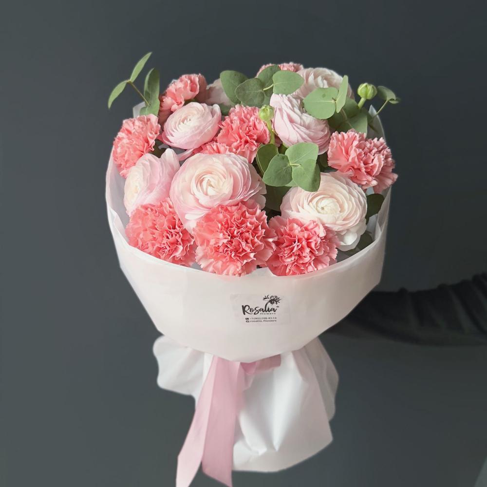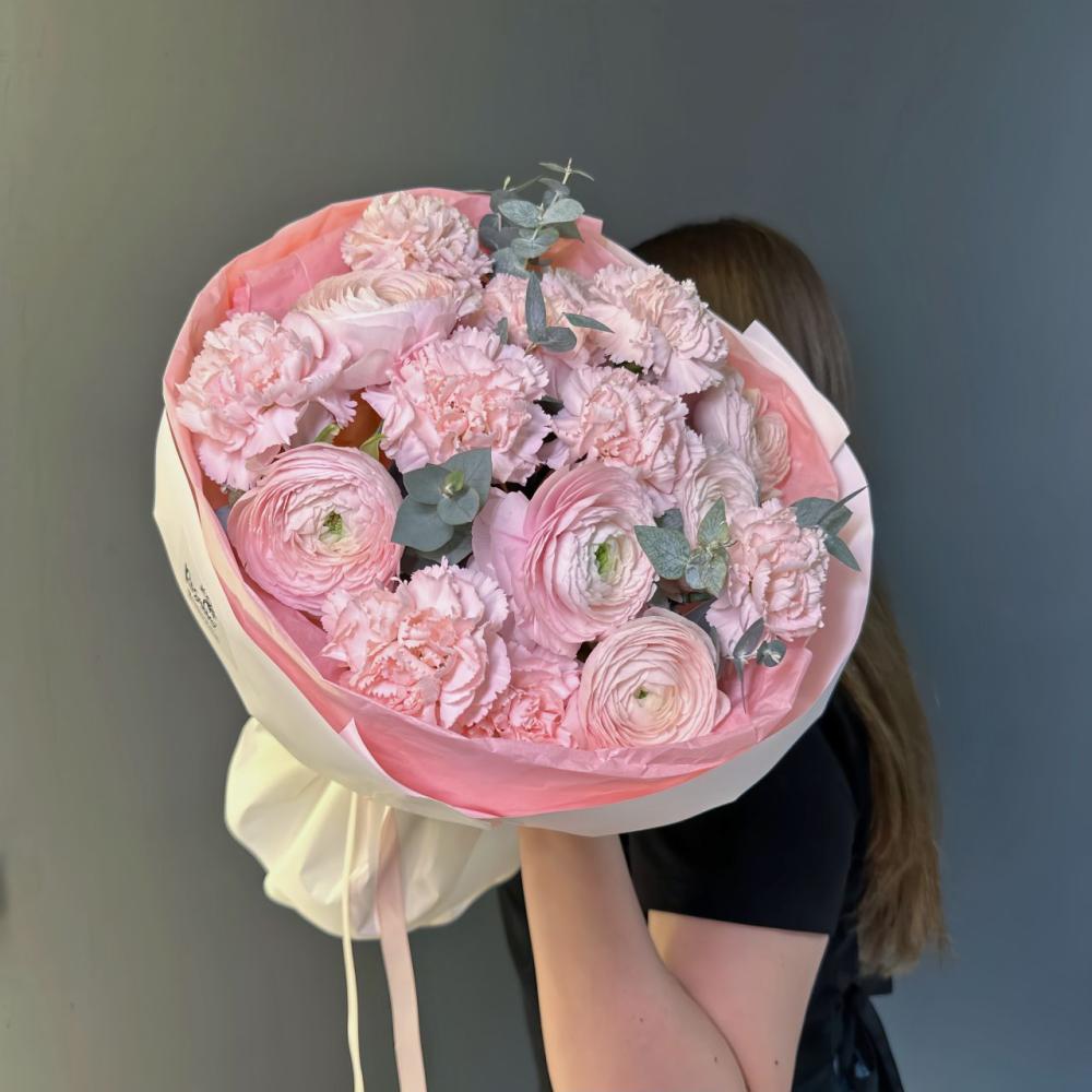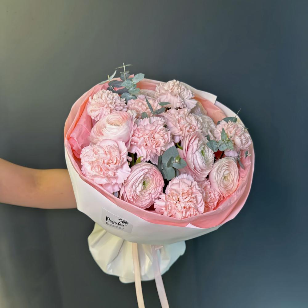 Воздушный - зефирный букет из ранункулюсов и диантуса для вашей любимой! Доставляется в транспортировочной коробке