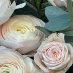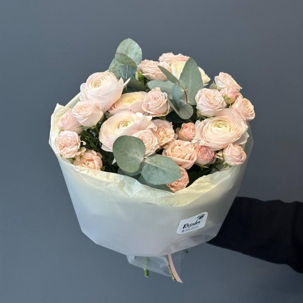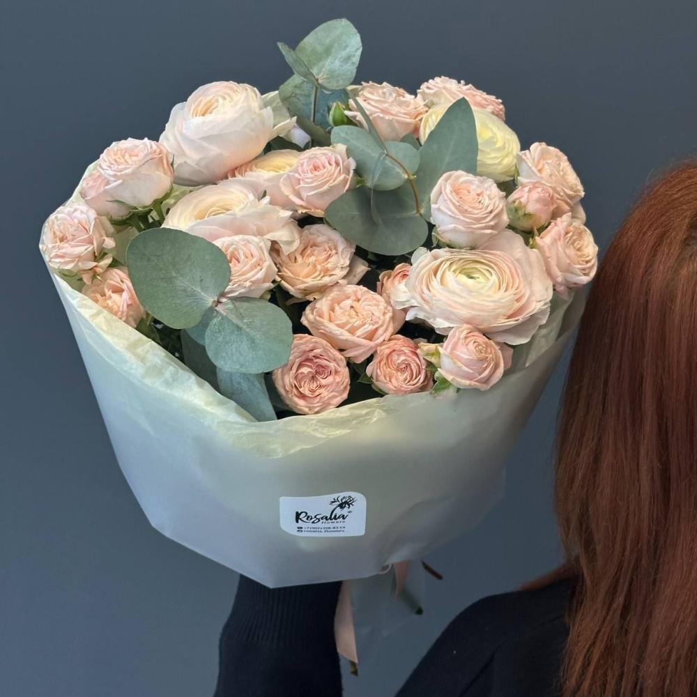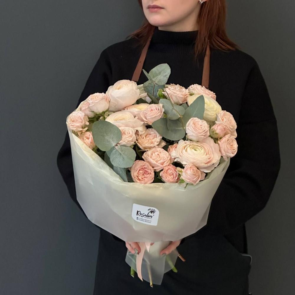 Нежный букет из ранункулюсов и пионовидных кустовых роз с добавлением эвкалипта Доставляется в транспортировочной коробке
