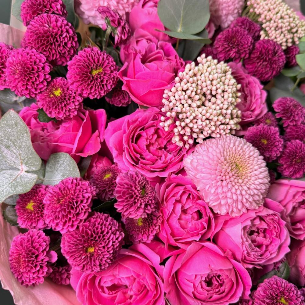 Яркий малиновый букет с кустовой пионовидной розой, одноголовыми и кустовыми хризантемами Доставляется в транспортировочной коробке