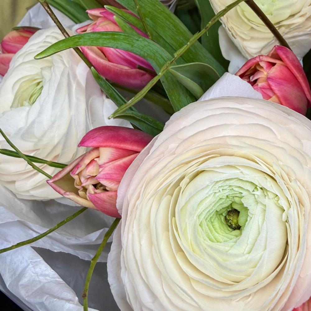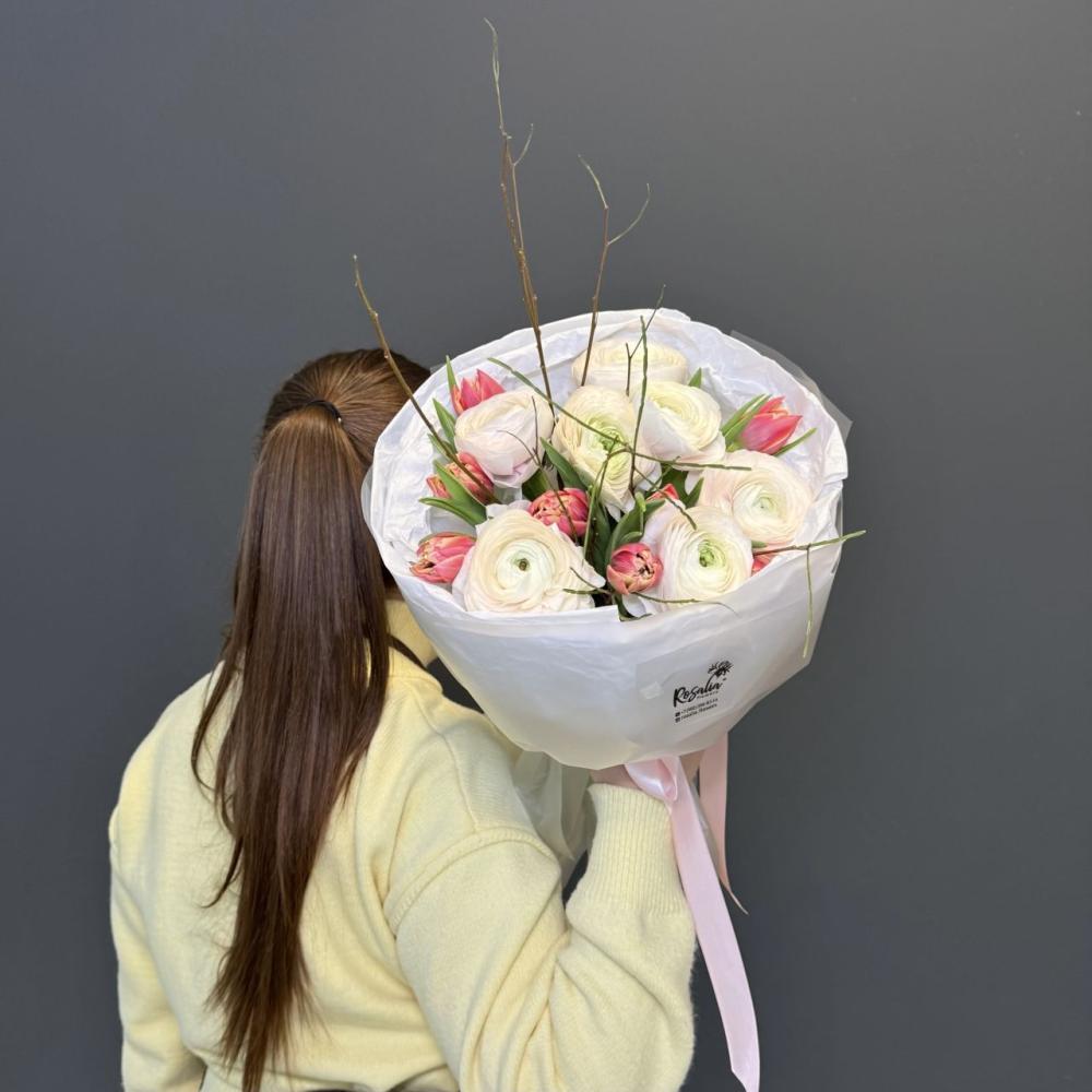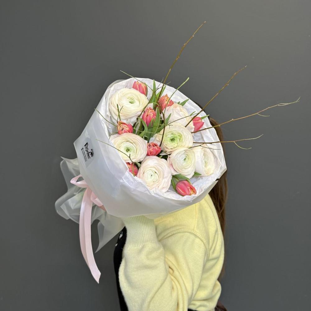 этот букет - олицетворение весны! Шикарные ранункулюсы, яркие пионы и ветки, дополняющие общую композицию Доставляется в транспортировочной коробке