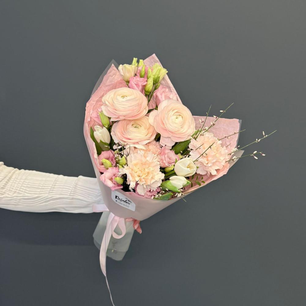 Нежный букет с прекрасными ранункулюсами и ароматной генистой. Этот букет поможет выразить чувства без слов. Доставляется в транспортировочной коробке