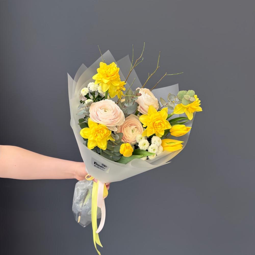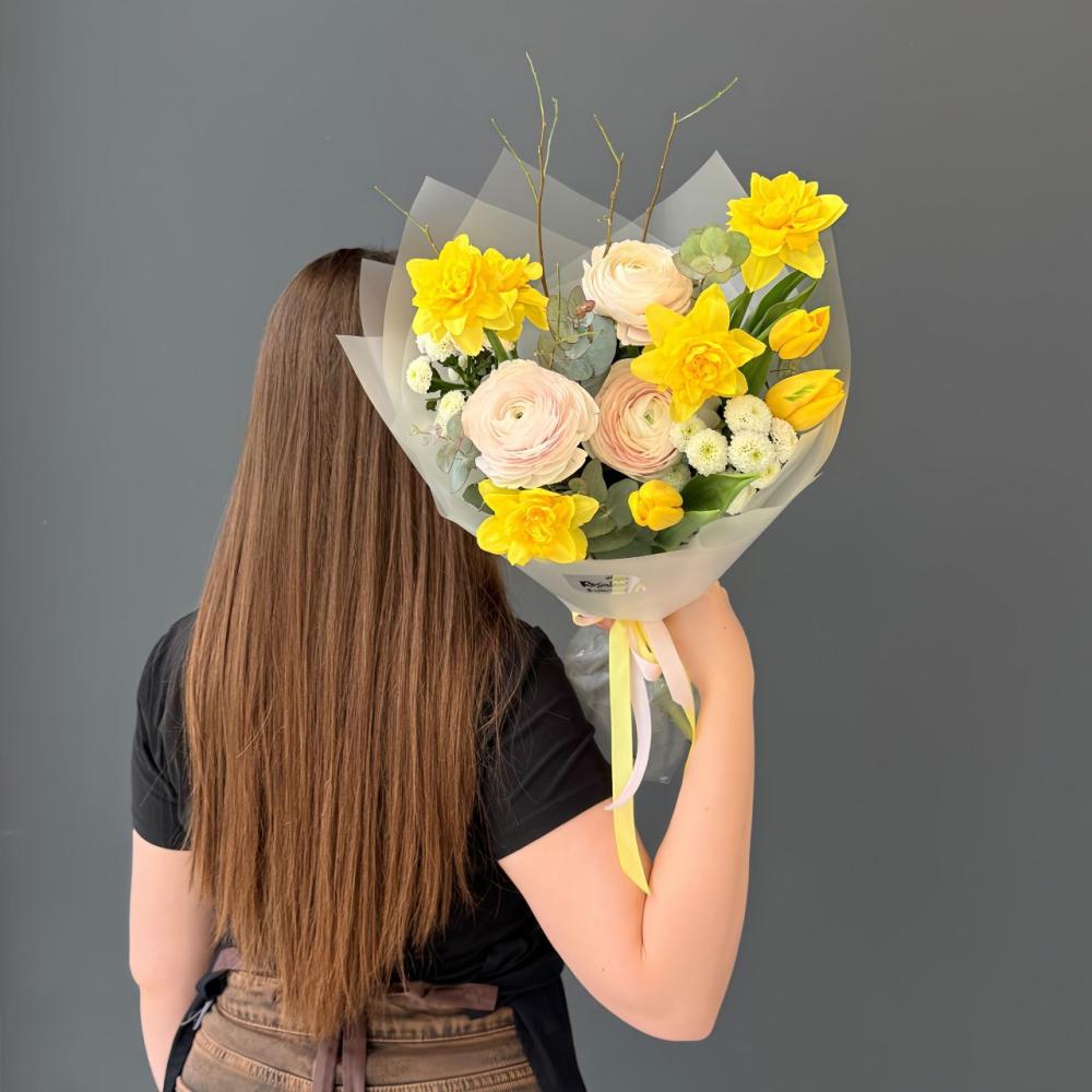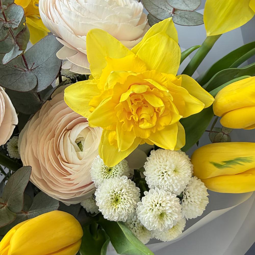 Букет, который подарит яркое весеннее настроение!Яркий ароматный желтый нарцисс и нежный ранункулюс образуют идеальное сочетание. Доставляется в транспортировочной коробке