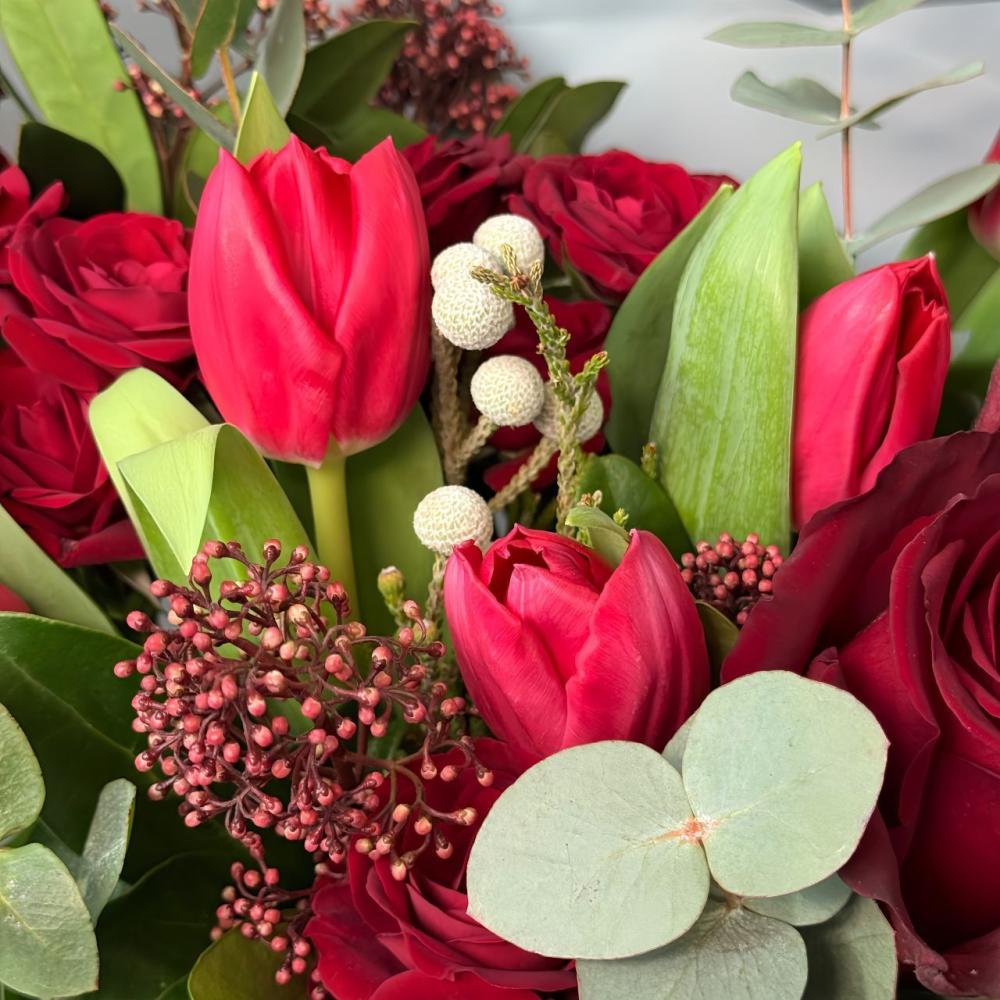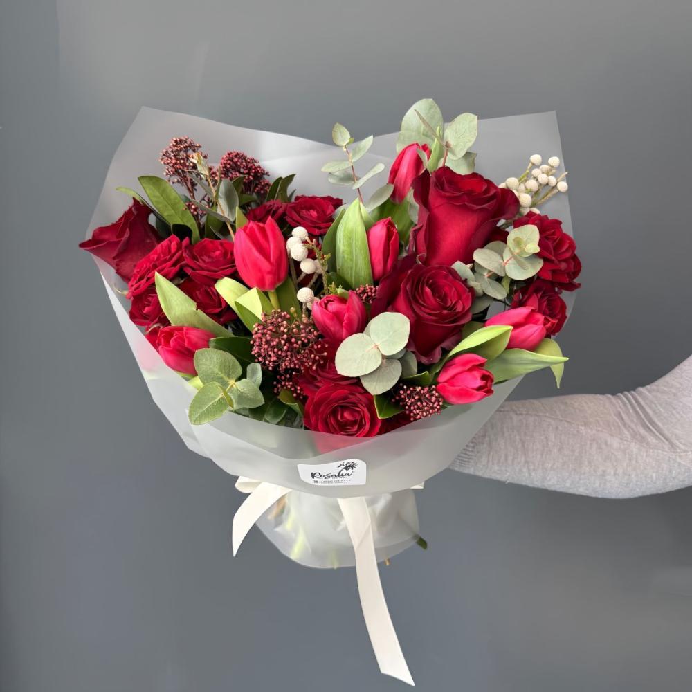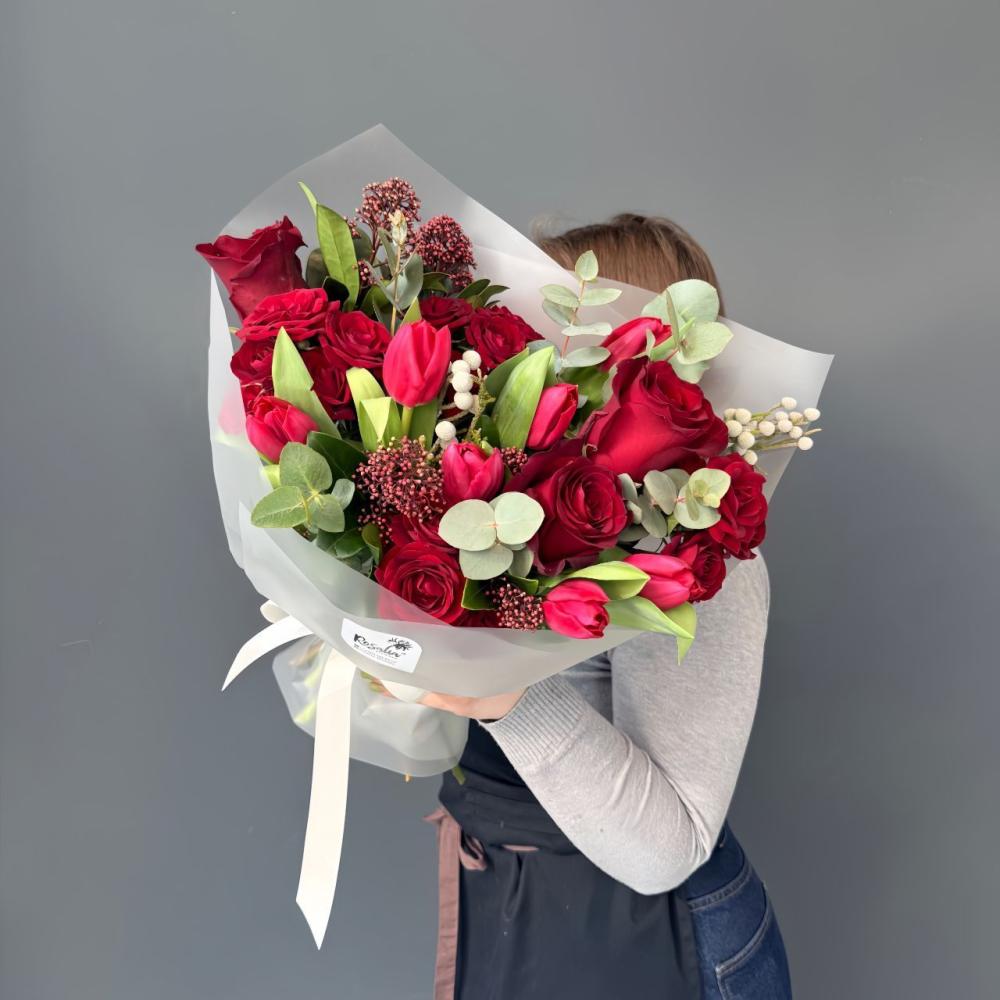 Яркий букет в красных оттенках с тюльпанами и розами для выражения самых трепетных чувств Доставляется в транспортировочной коробке