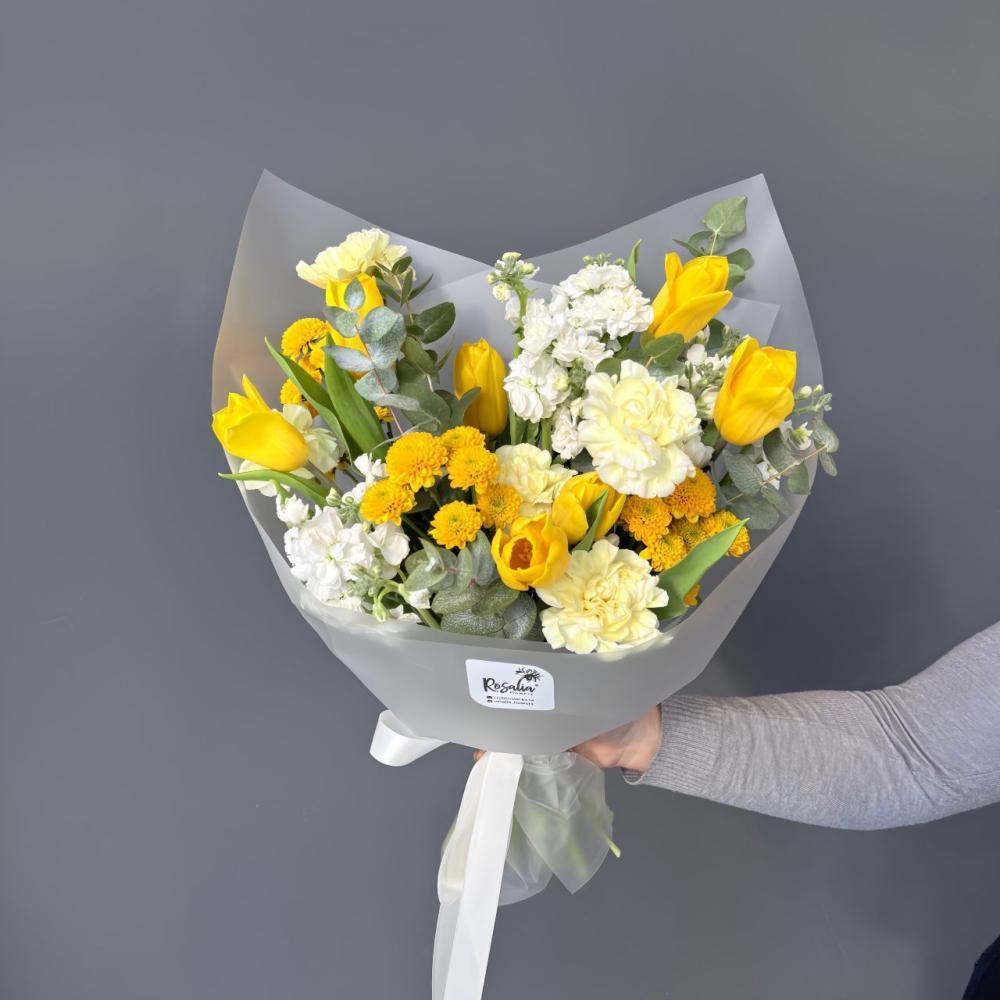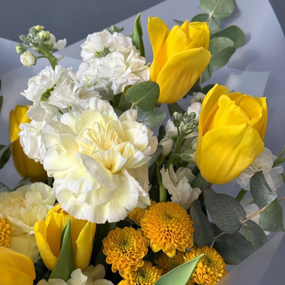 Букет в ярких цветах с маттиолой, желтым тюльпаном и диантусом Доставляется в транспортировочной коробке