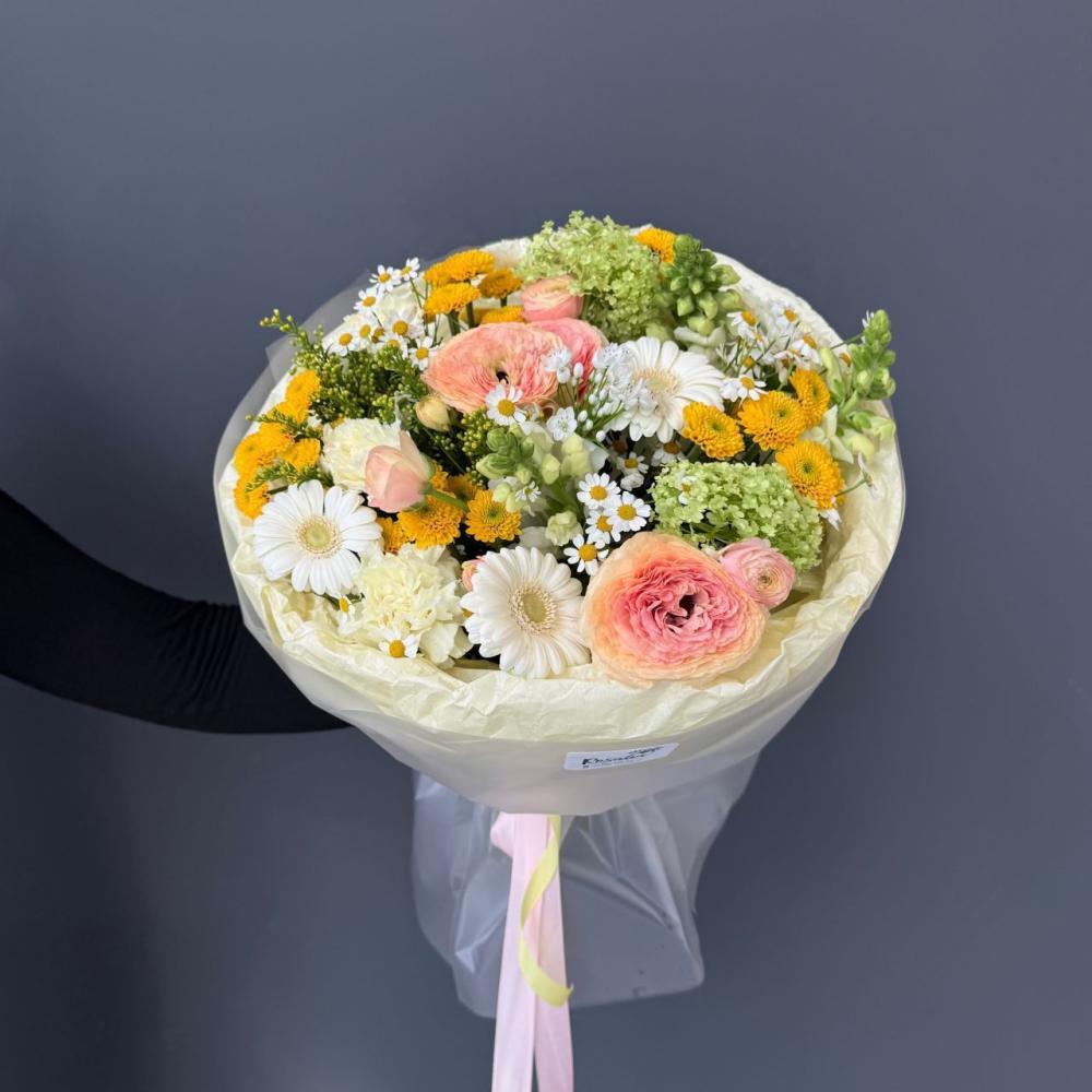 Яркий букет, собранный в полевом стиле с добавлением танацетума и ранункулюсов подарит ощущение тепла. Доставляется в транспортировочной коробке.