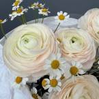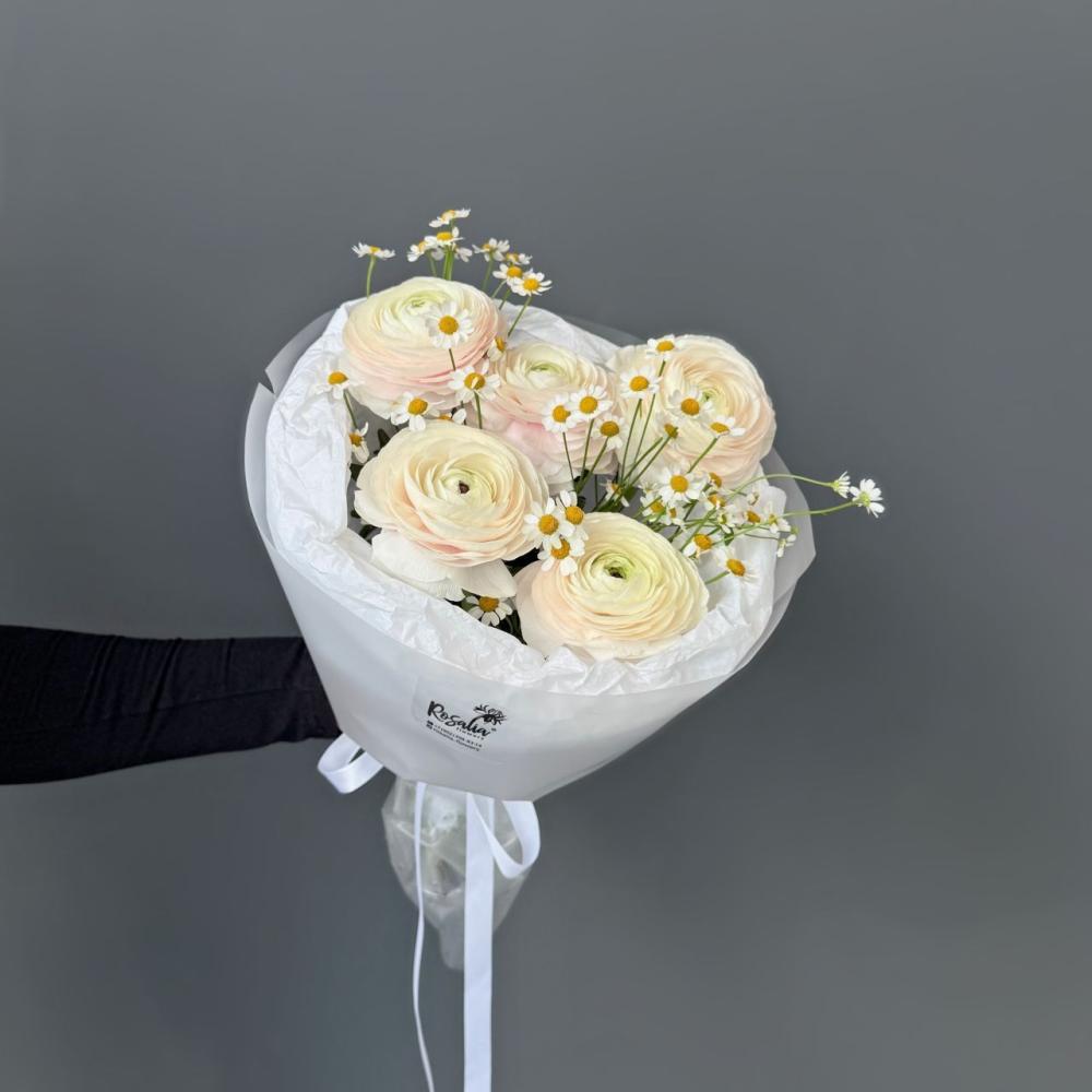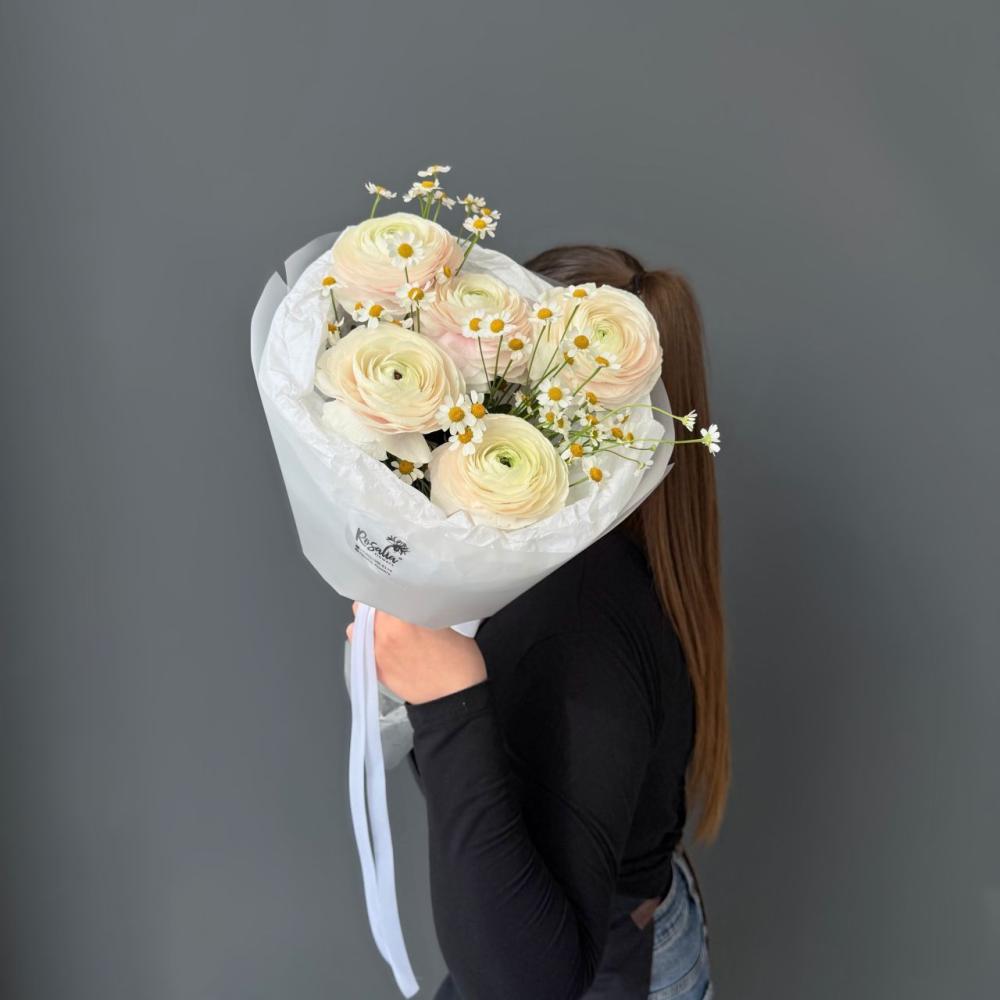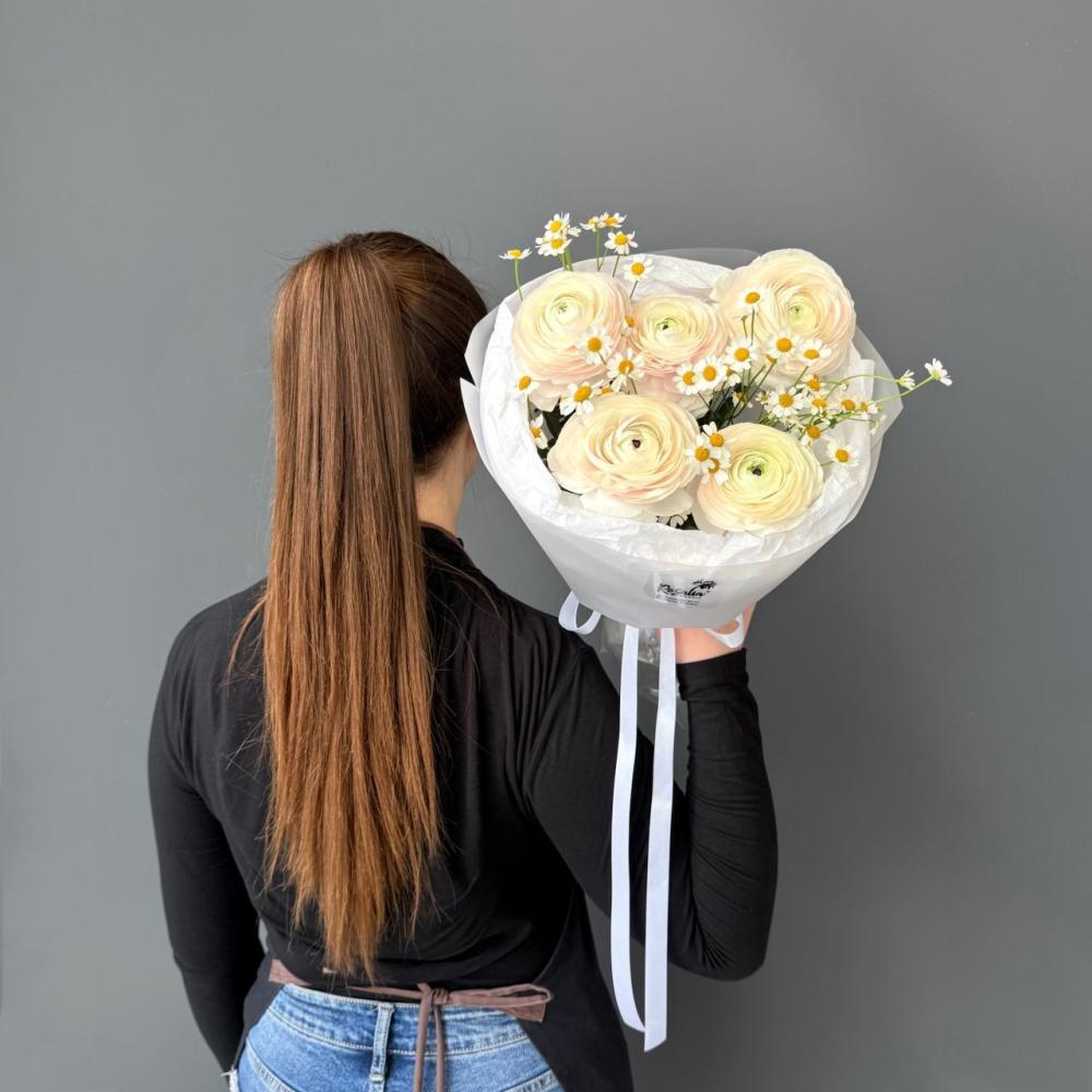 Букет-комплимент из ранункулюсов и танацетума, подарит нежность и тепло этого дня. Доставляется в транспортировочной коробке