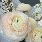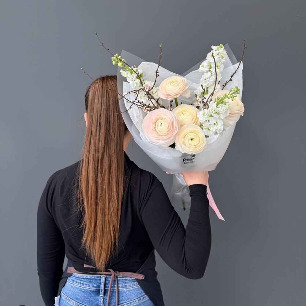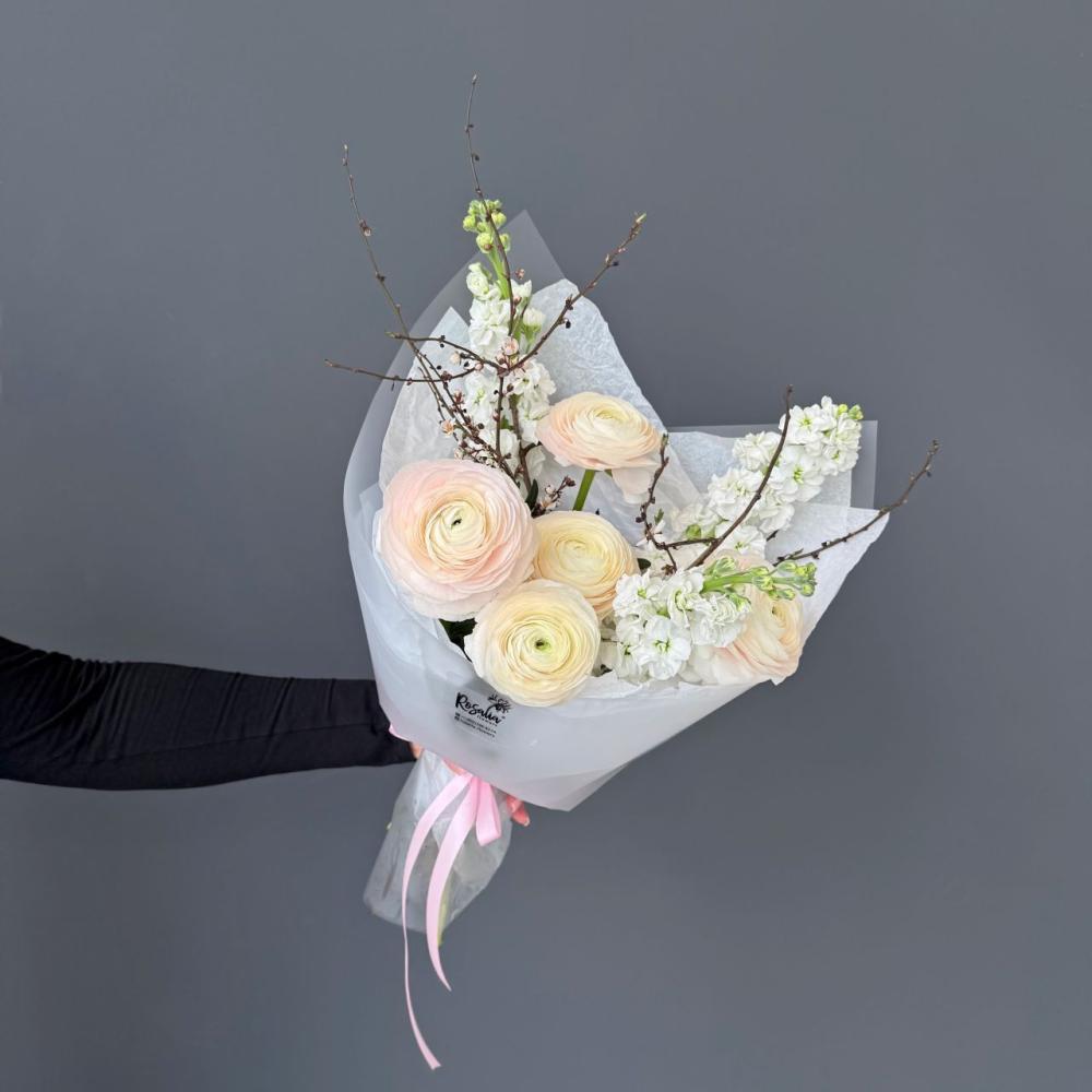 Букет с ароматной маттиолой, нежным ранункулюсом и весенними цветущими ветками. Доставляется в транспортировочной коробке.