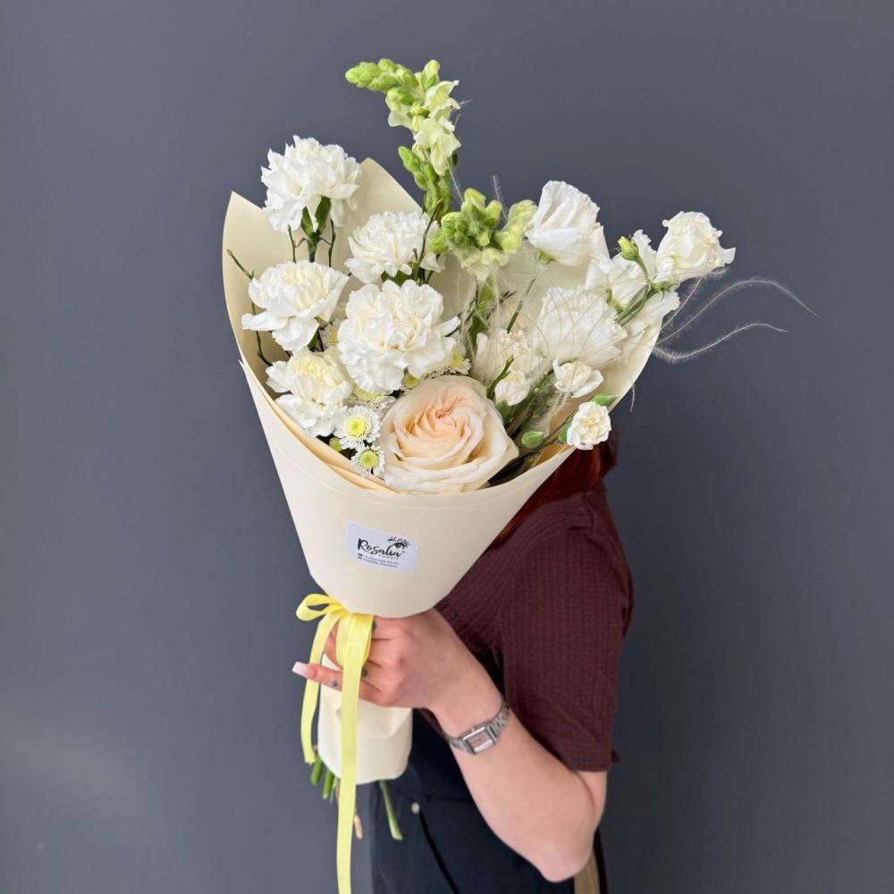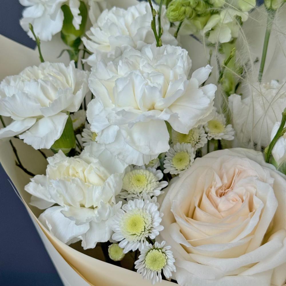 Букет в светлых оттенках - идеальный подарок. Сочетание ароматной пионовидной розы сорта вайт охара и антира задающего, форму покорит любое сердце. Доставляется в транспортировочной коробке.