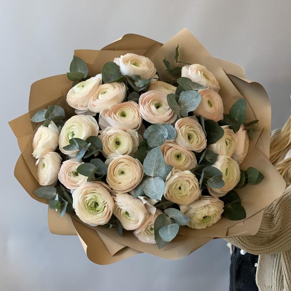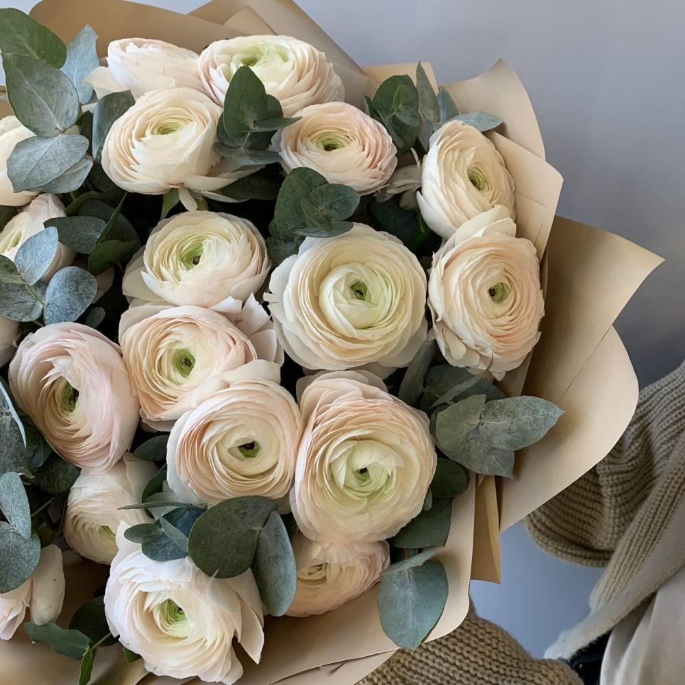 Монобукет из нежных стойких ранункулюсов Доставляется в транспортировочной коробке
