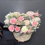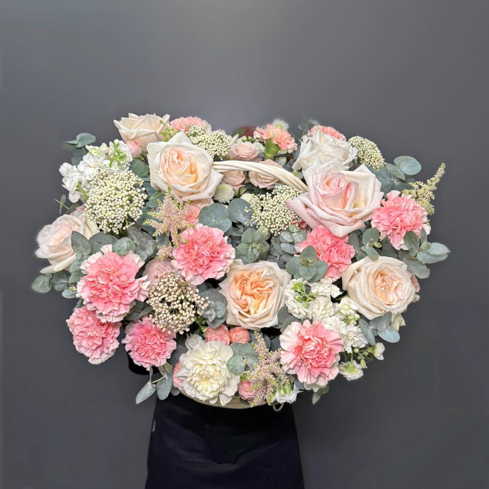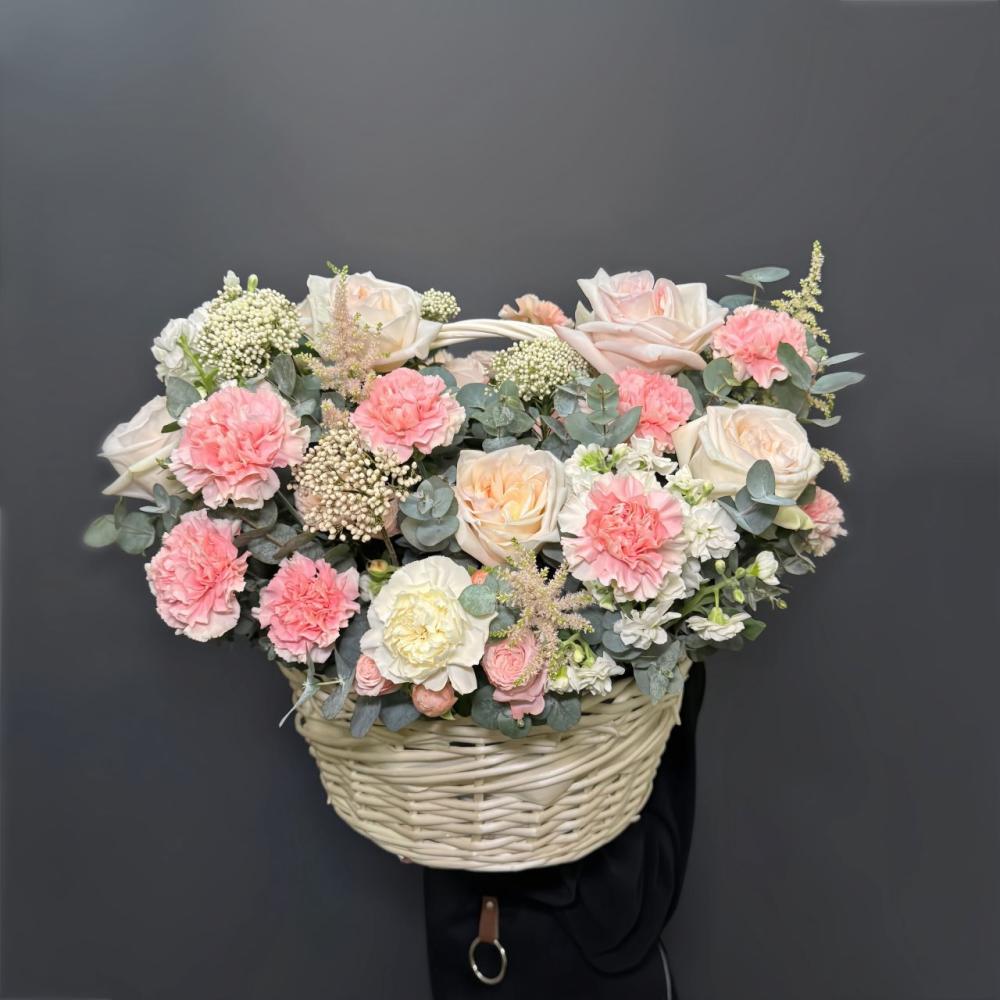 Нежная корзина с гвоздиками и пионовидными розами, которая попадет в самое сердце получателя
