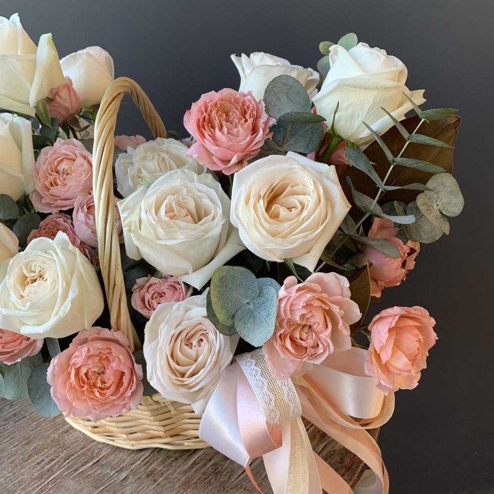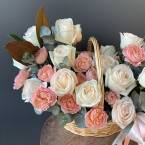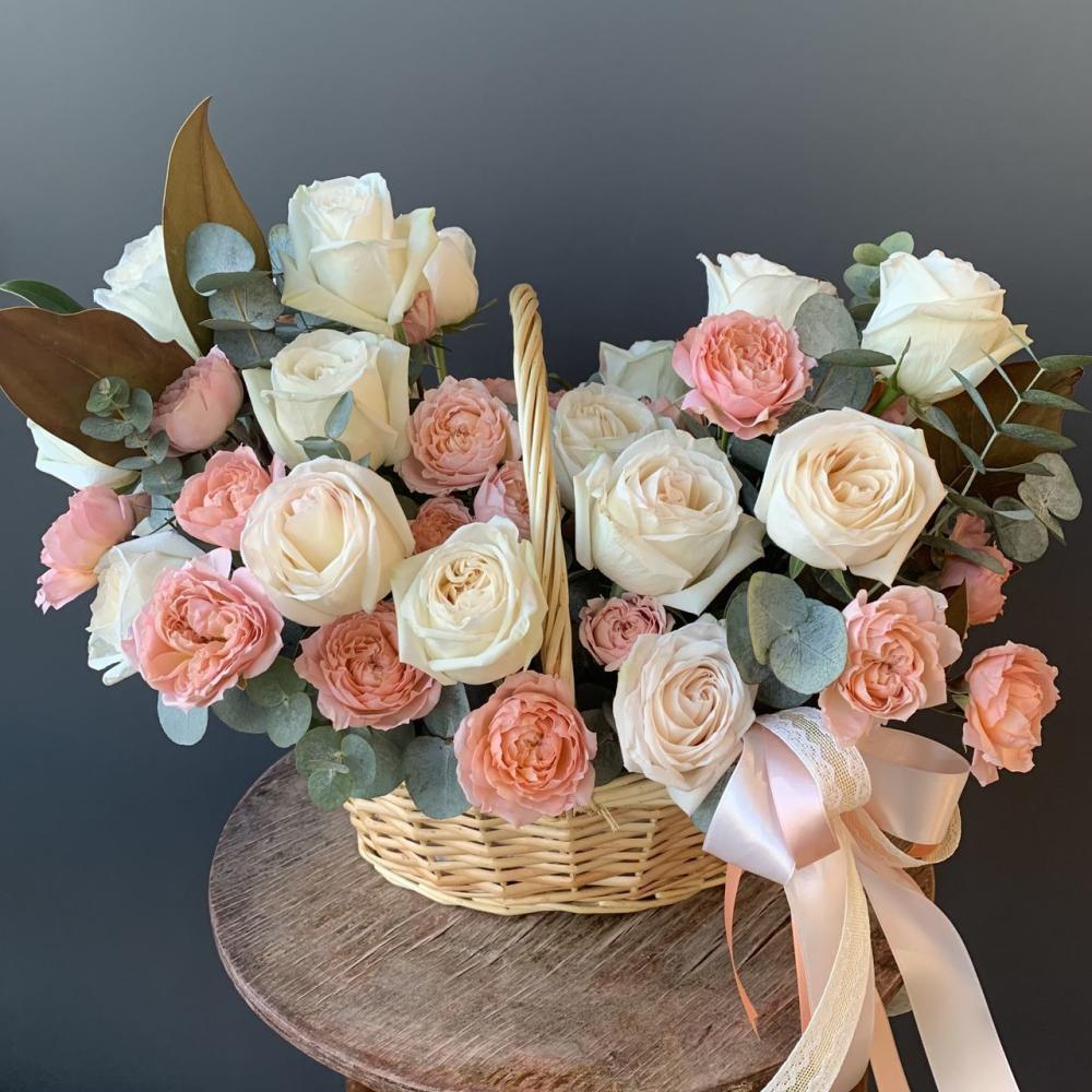 Корзина из ароматных пионовидных роз - Вайт Охара и кустовая Джульетта
