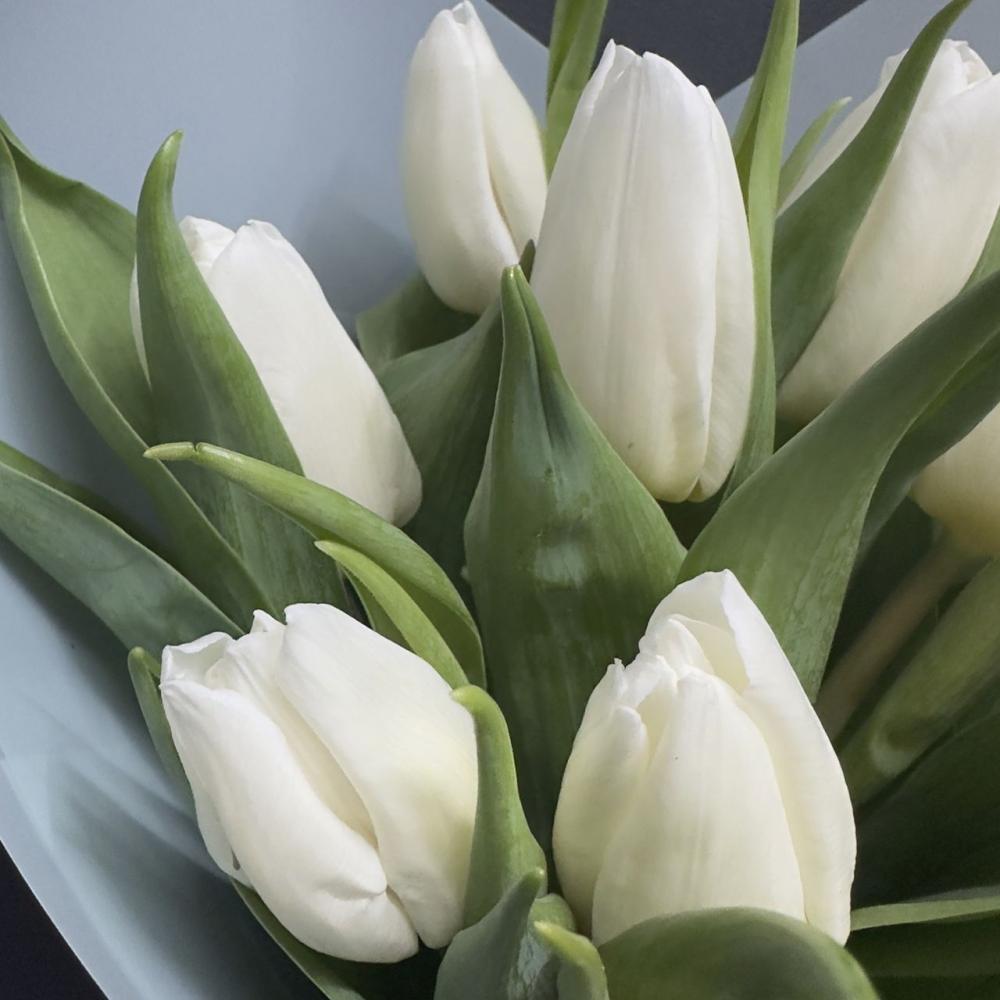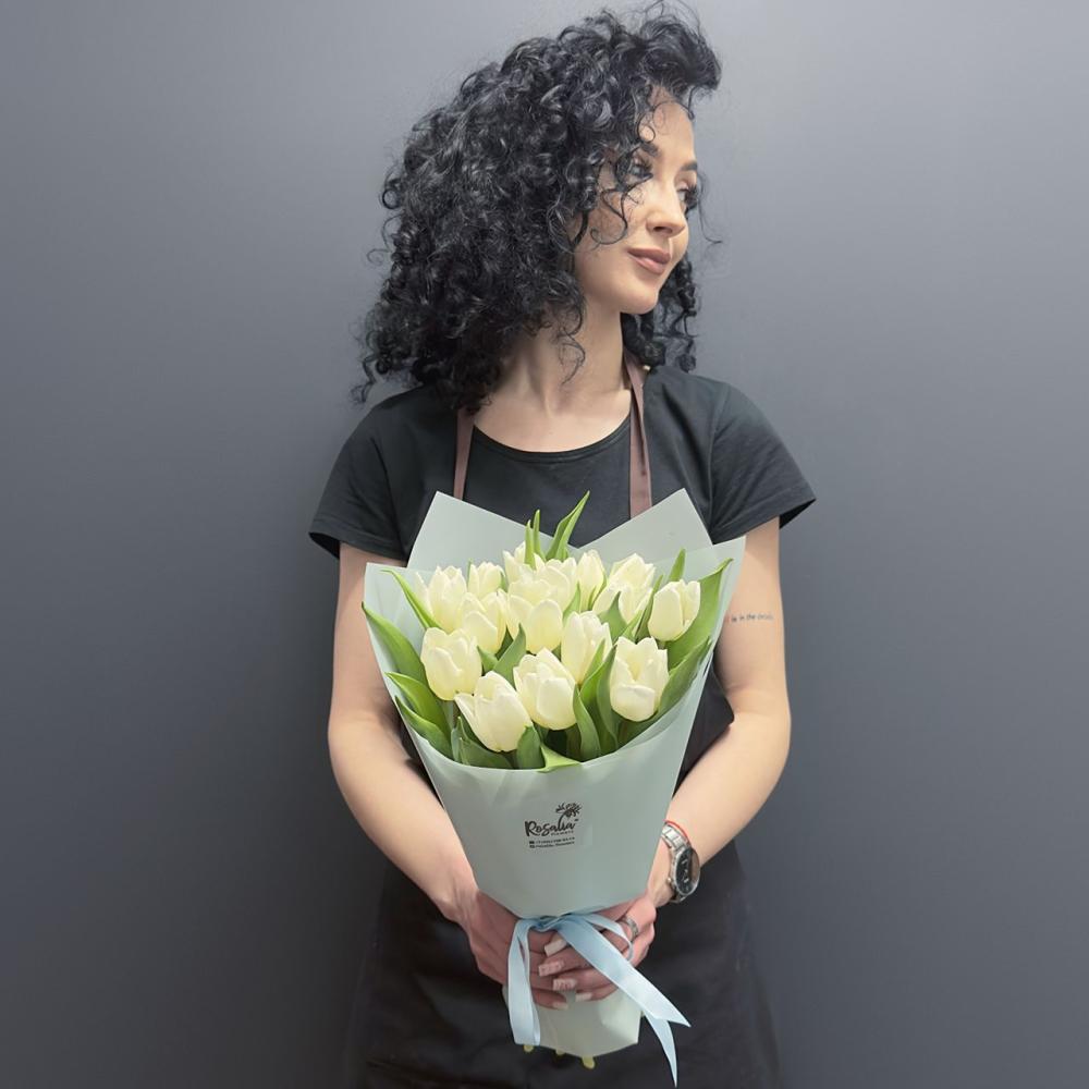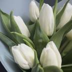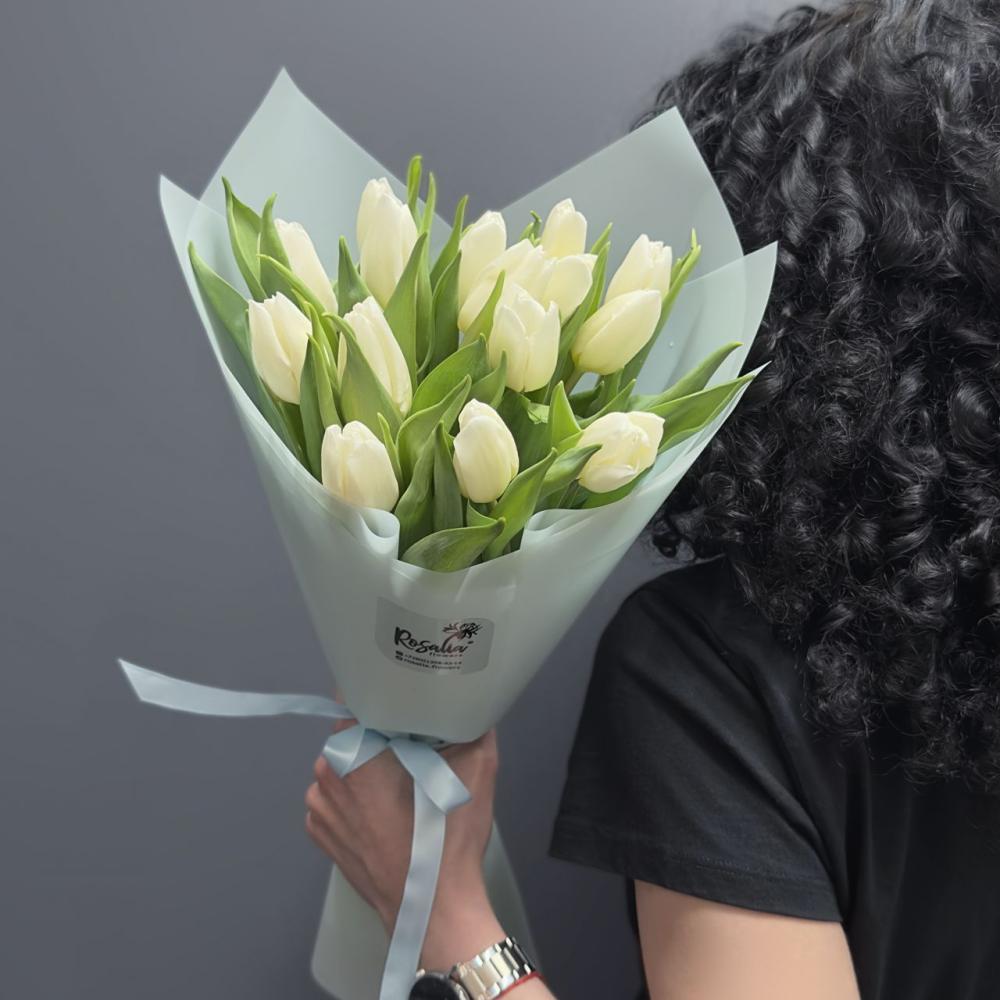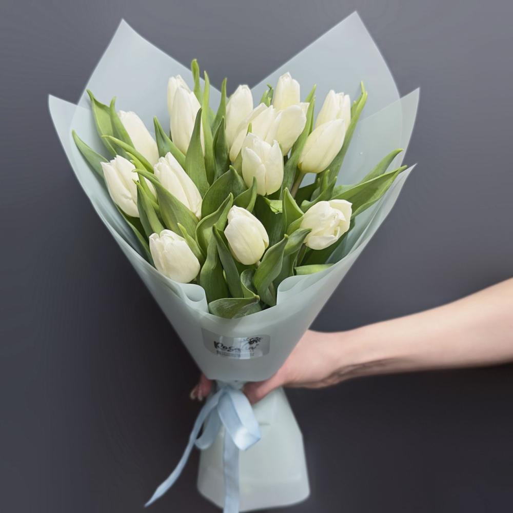 Монобукет из 15 белых тюльпанов с оформлением Доставляется в транспортировочной коробке