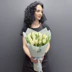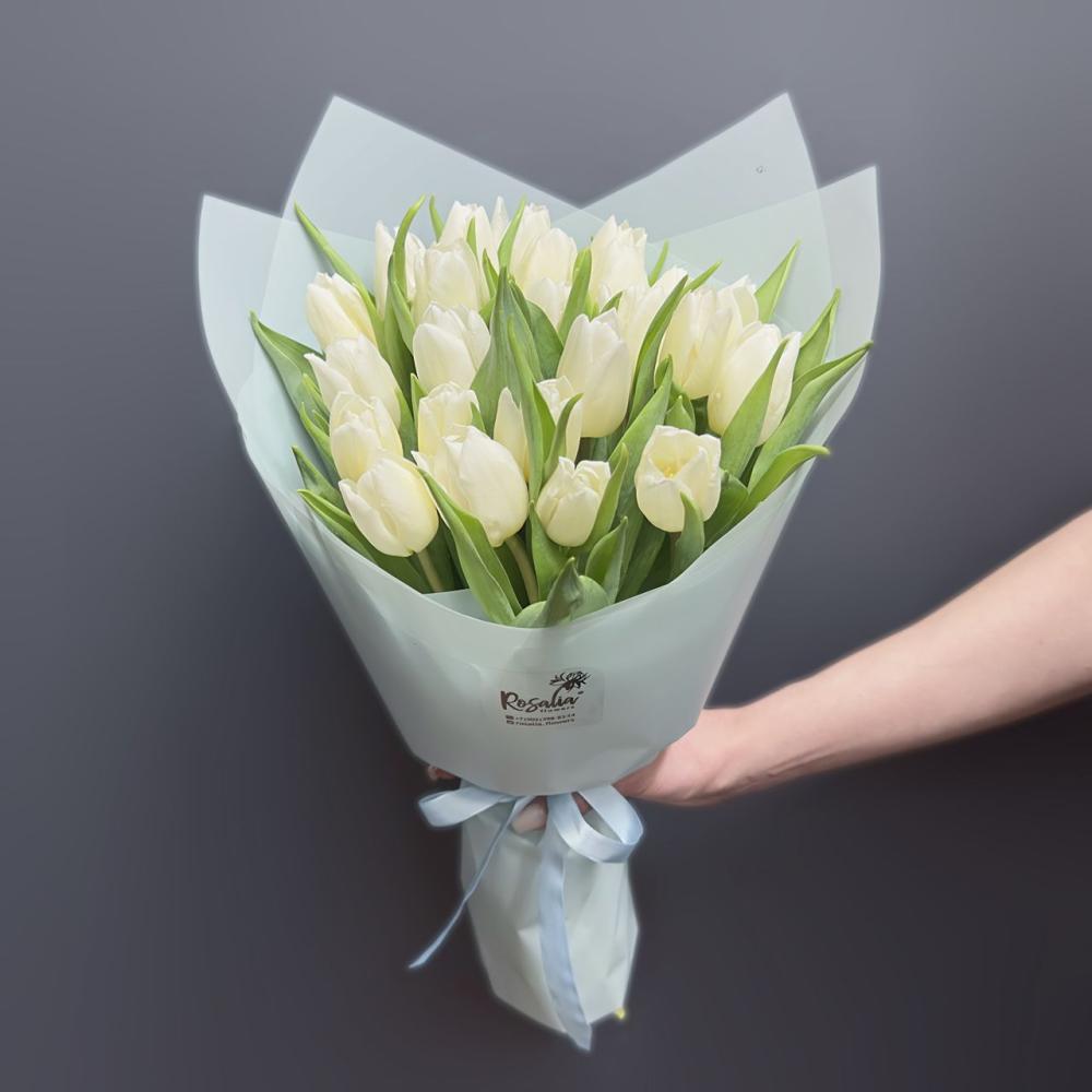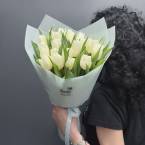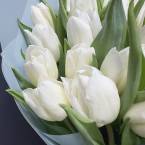 Монобукет из 25 белых пионовидных тюльпанов с оформлением Доставляется в транспортировочной коробке