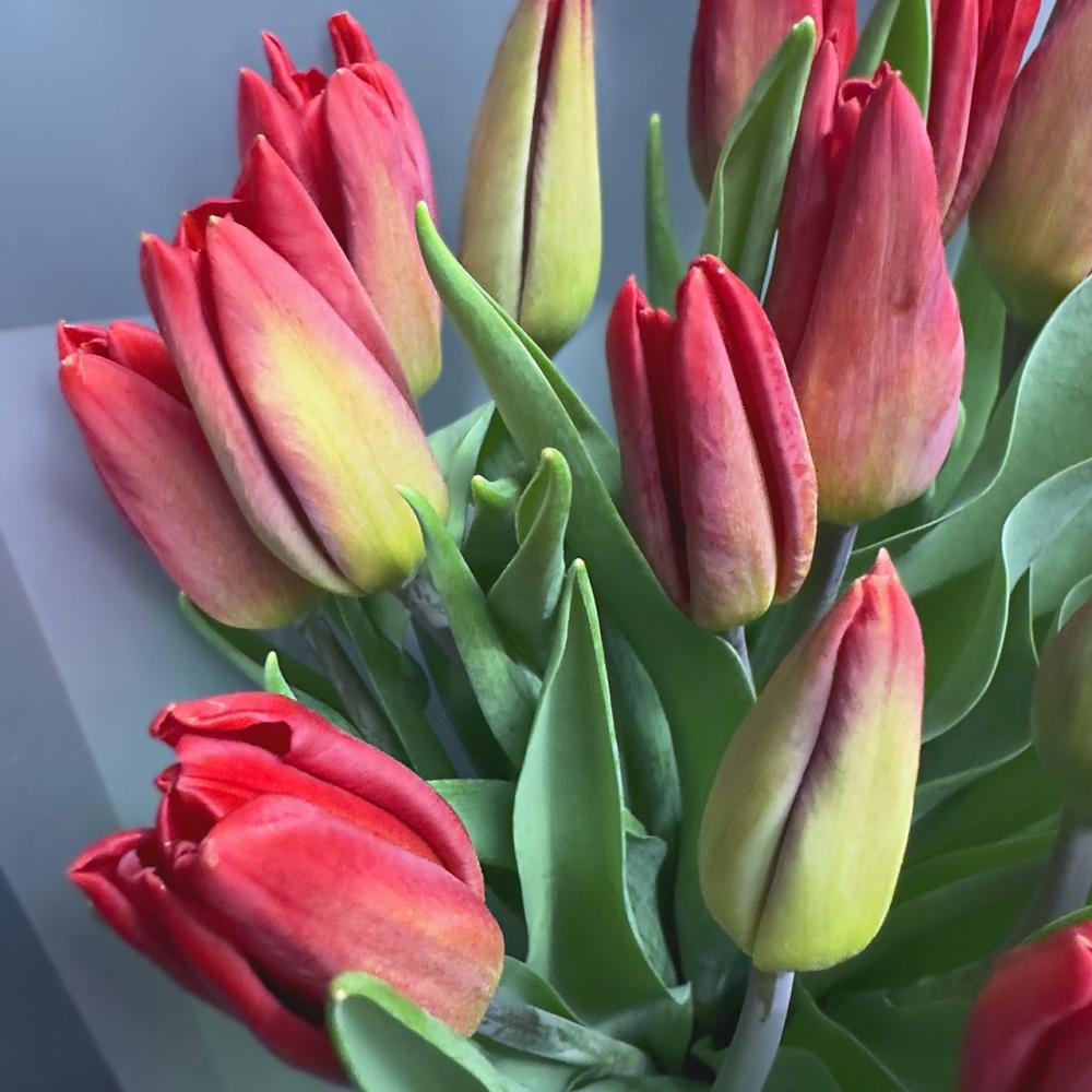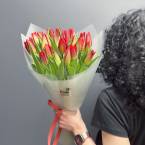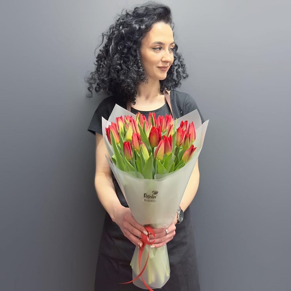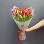 Монобукет из 25 красных тюльпанов с оформлением Доставляется в транспортировочной коробке