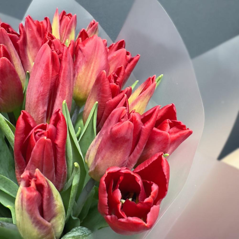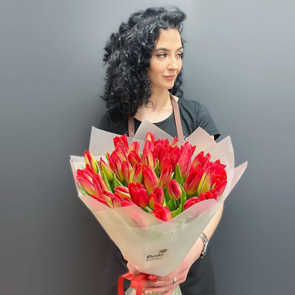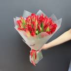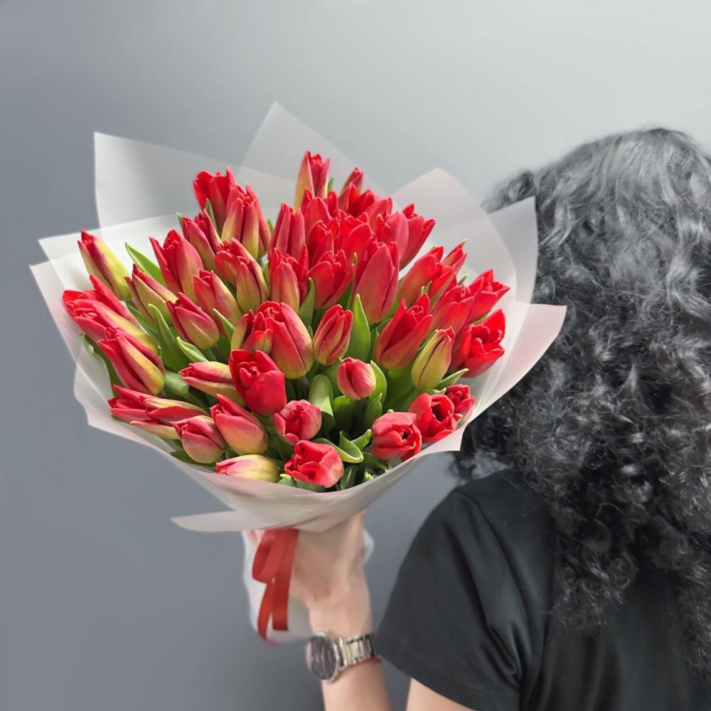Монобукет из 51 красного тюльпана с оформлением Доставляется в транспортировочной коробке