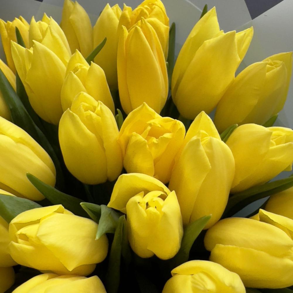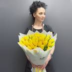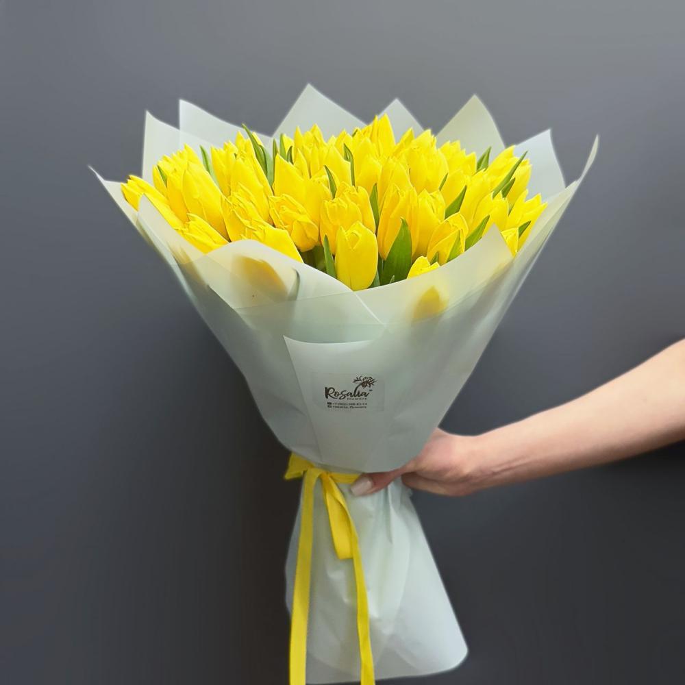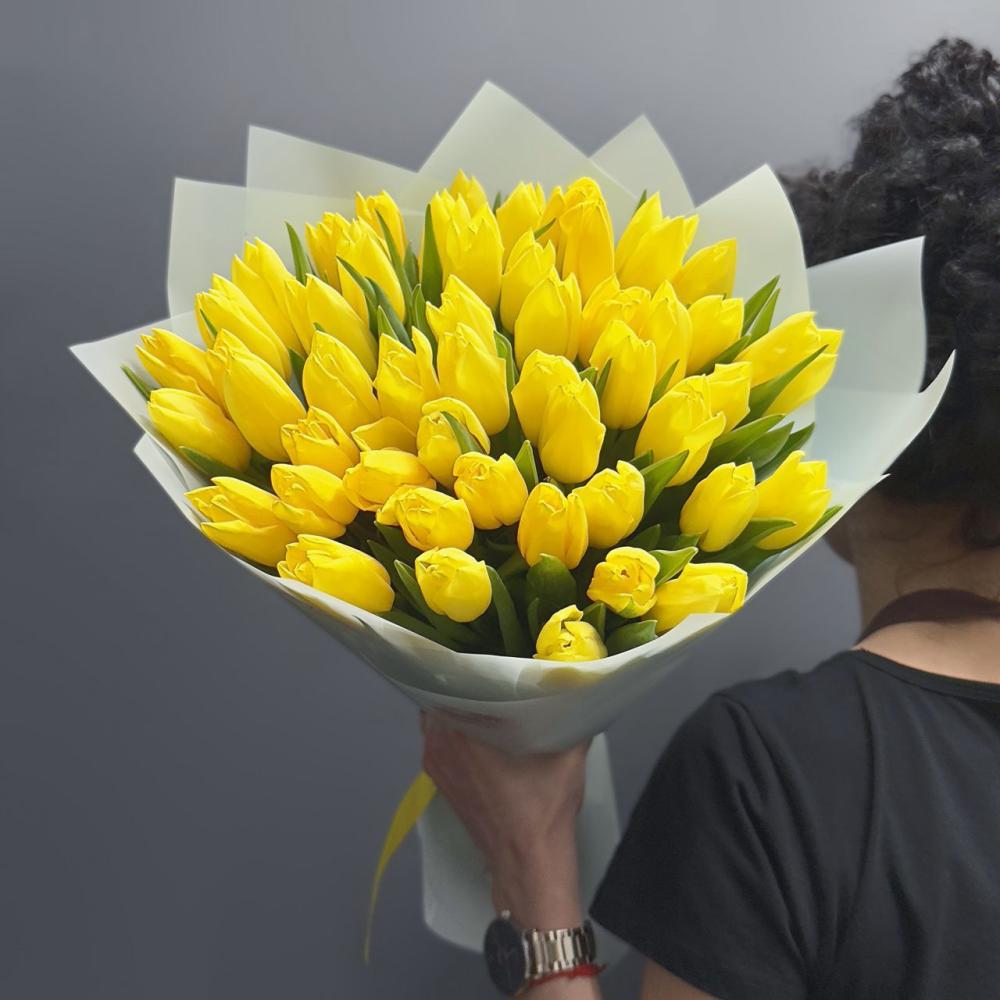 Монобукет из 51 желтого тюльпана с оформлением Доставляется в транспортировочной коробке