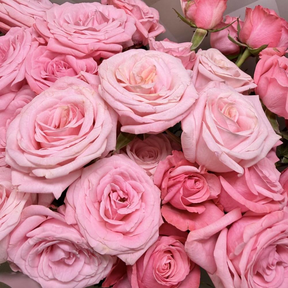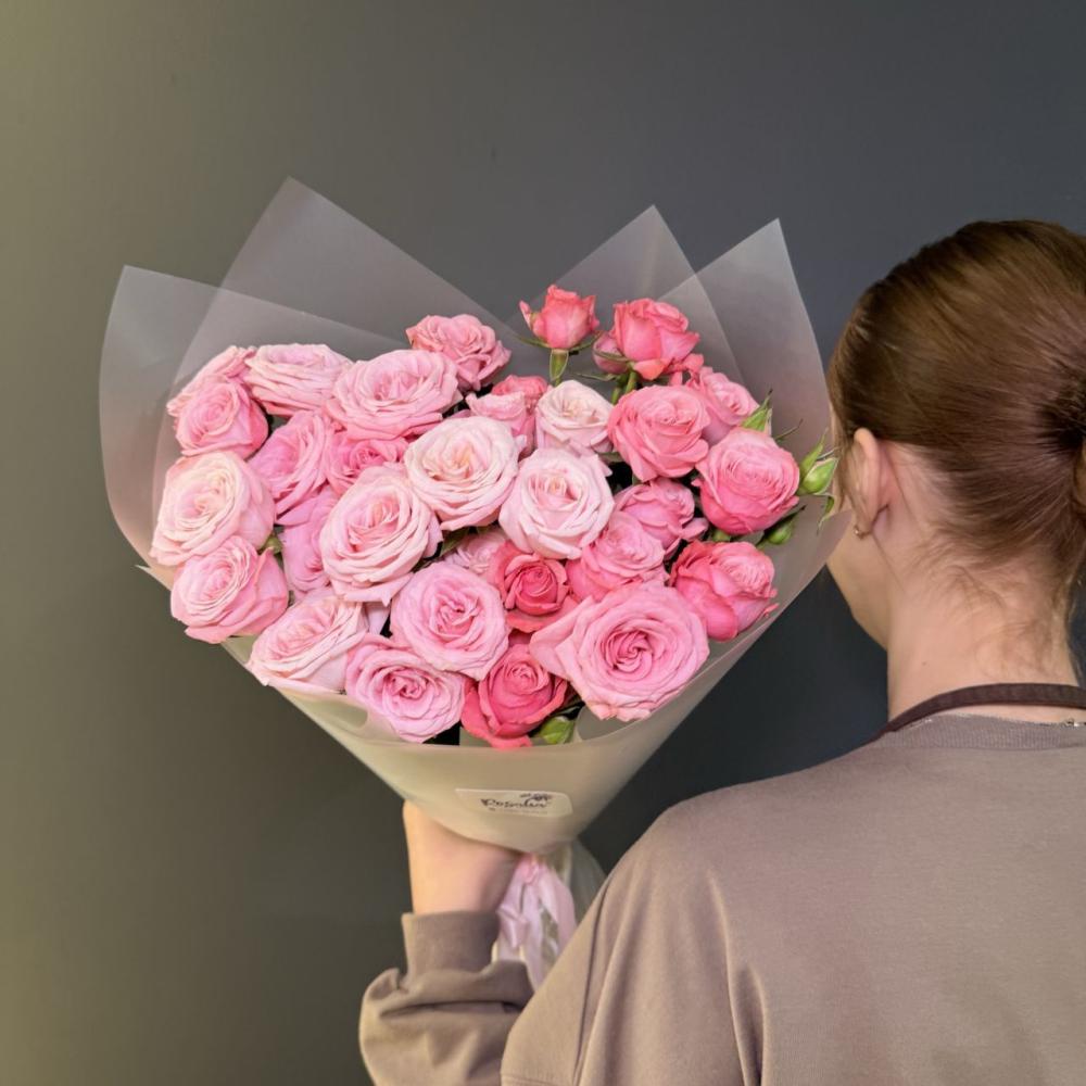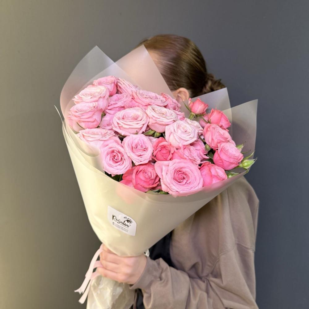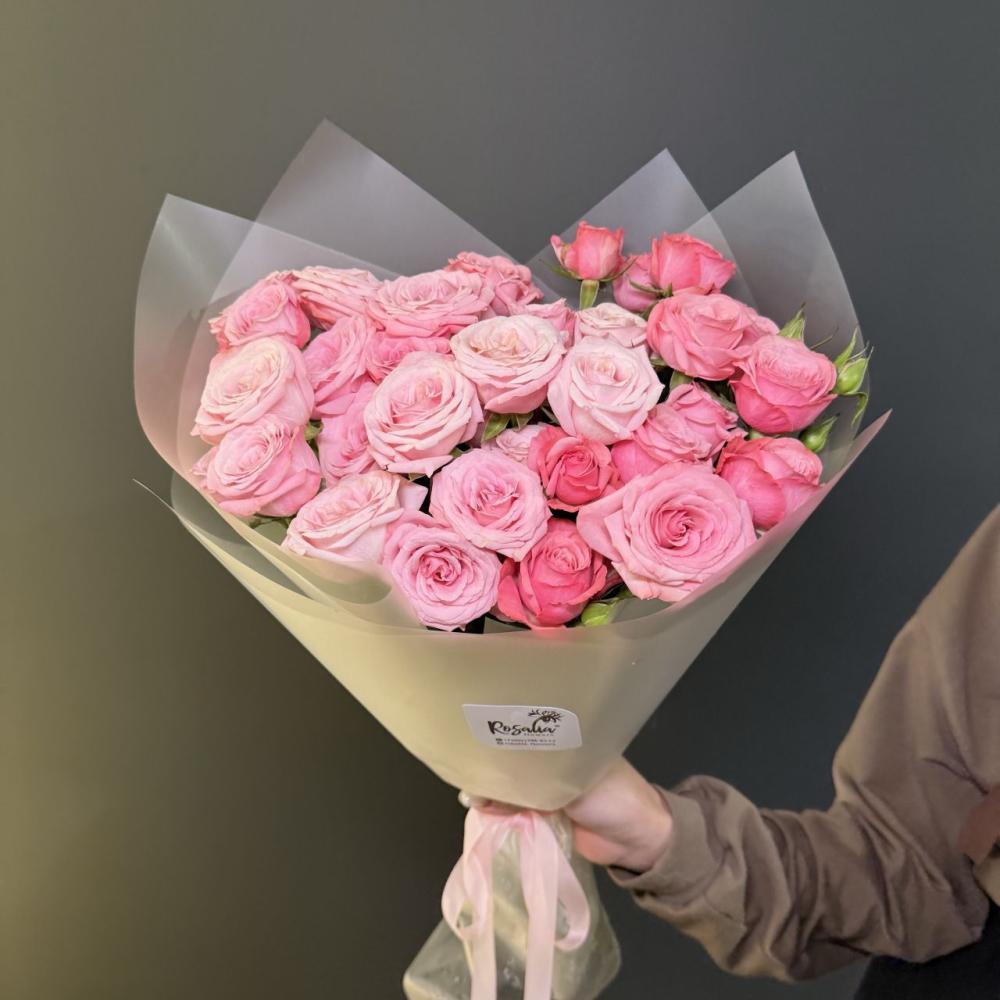 Монобукет из 7 кустовых роз с оформлением Доставляется в транспортировочной коробке