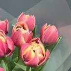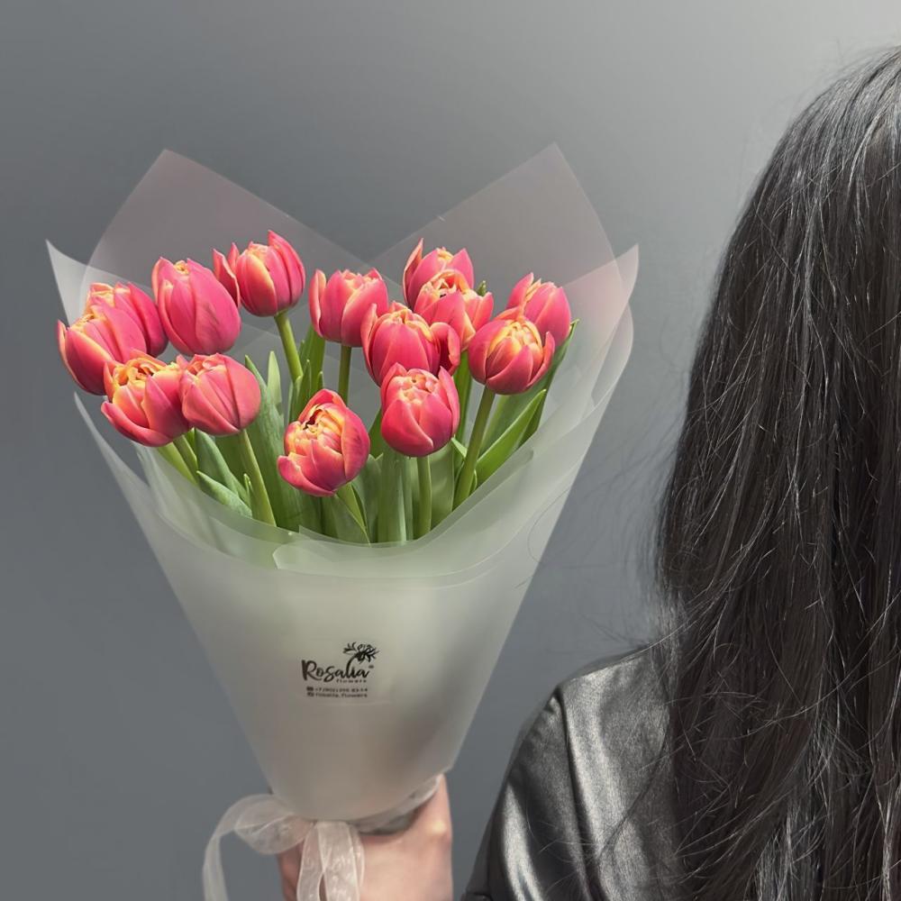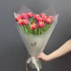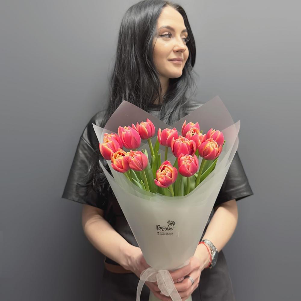 Монобукет из 15 тюльпанов Колумбус с оформлением Доставляется в транспортировочной коробке