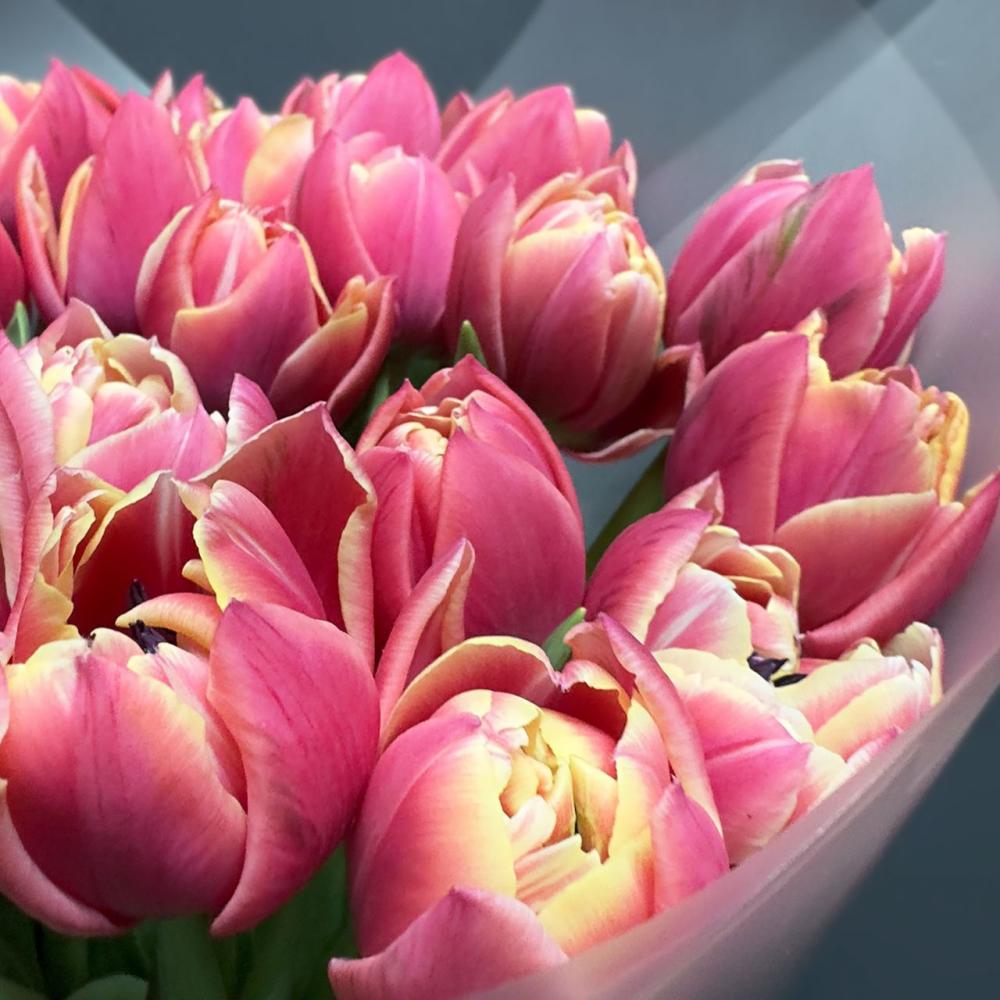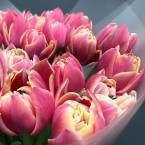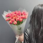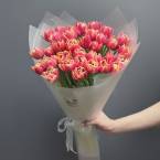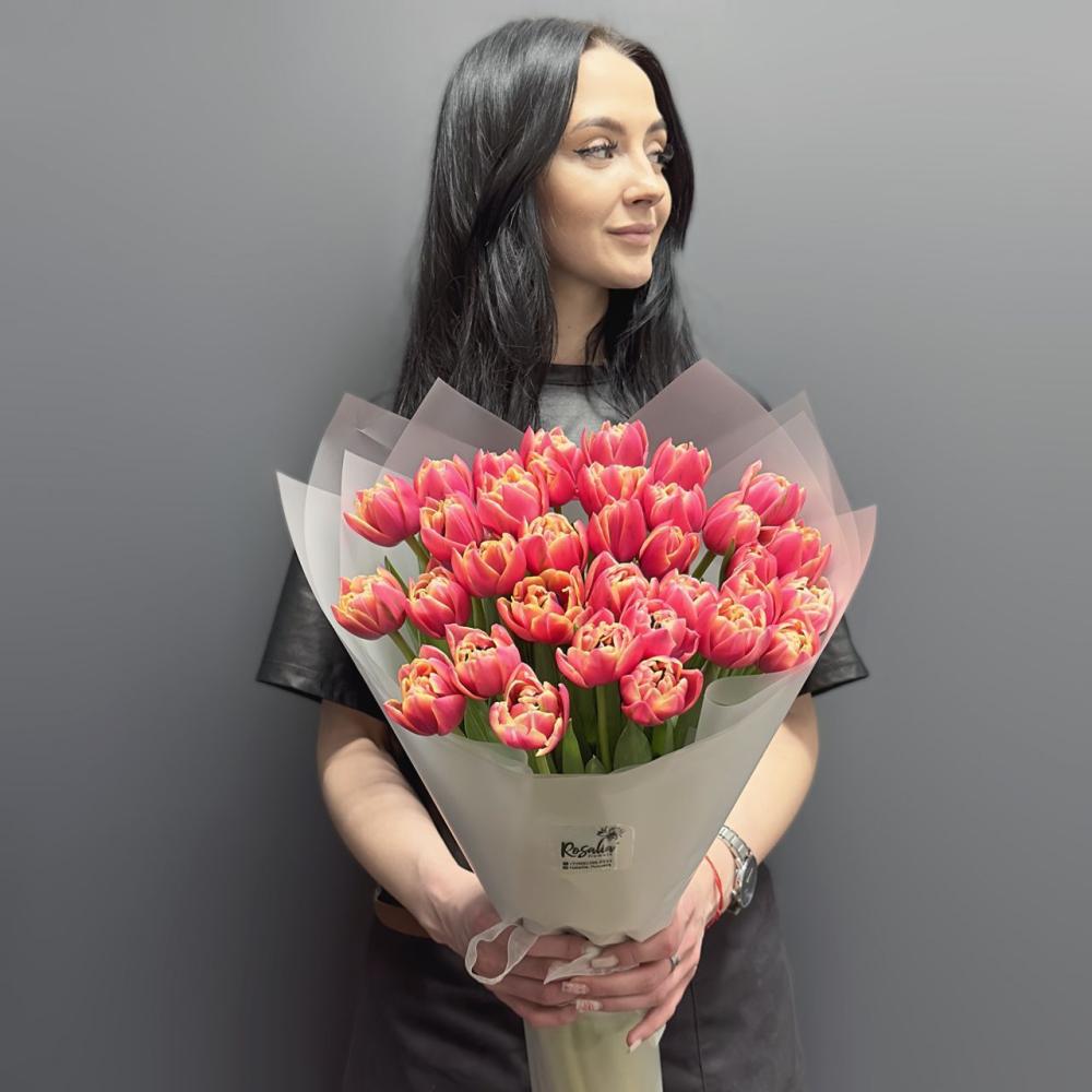Монобукет из 35 тюльпанов Колумбус с оформлением Доставляется в транспортировочной коробке