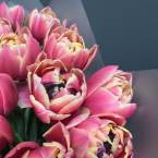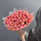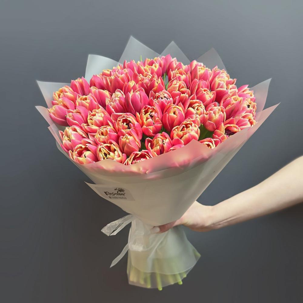Монобукет из 51 тюльпана Колумбус с оформлением Доставляется в транспортировочной коробке