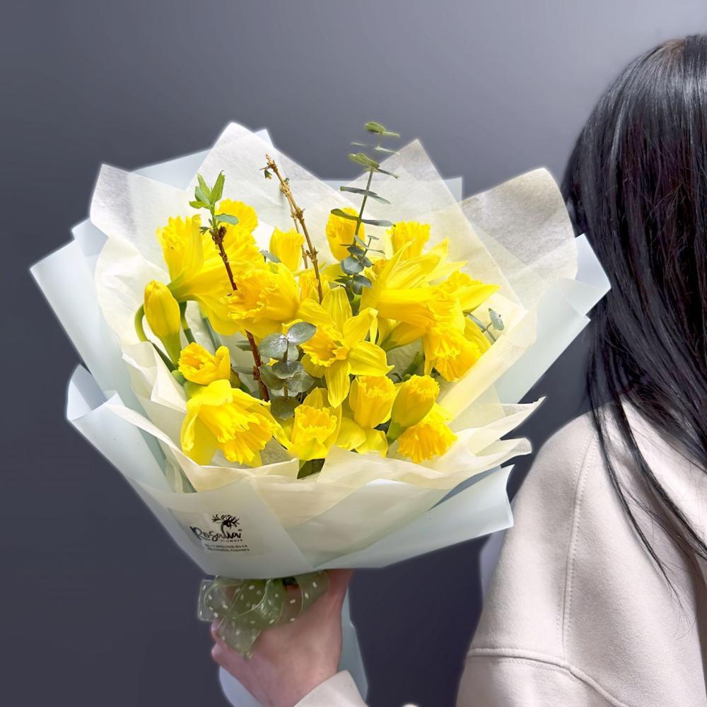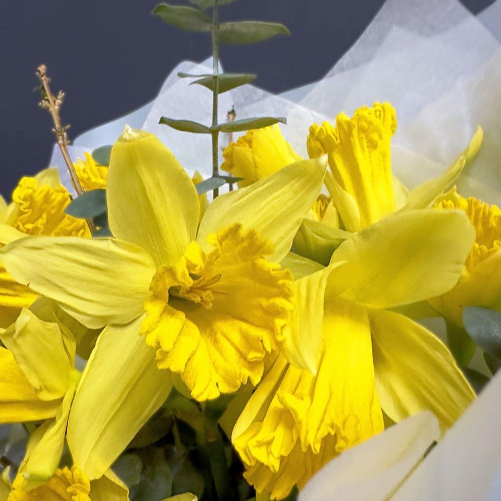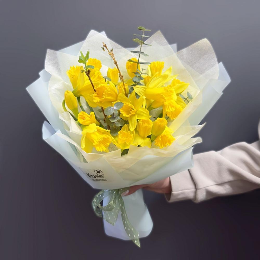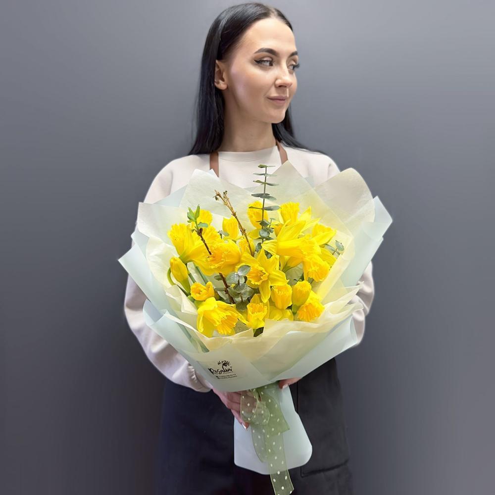 Солнечный букет из 21 нарцисса с добавлением эвкалипта Доставляется в транспортировочной коробке