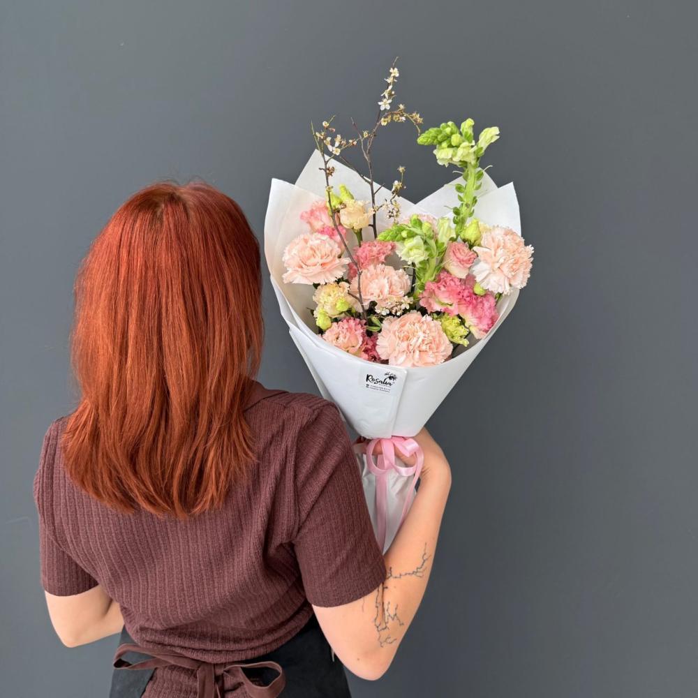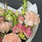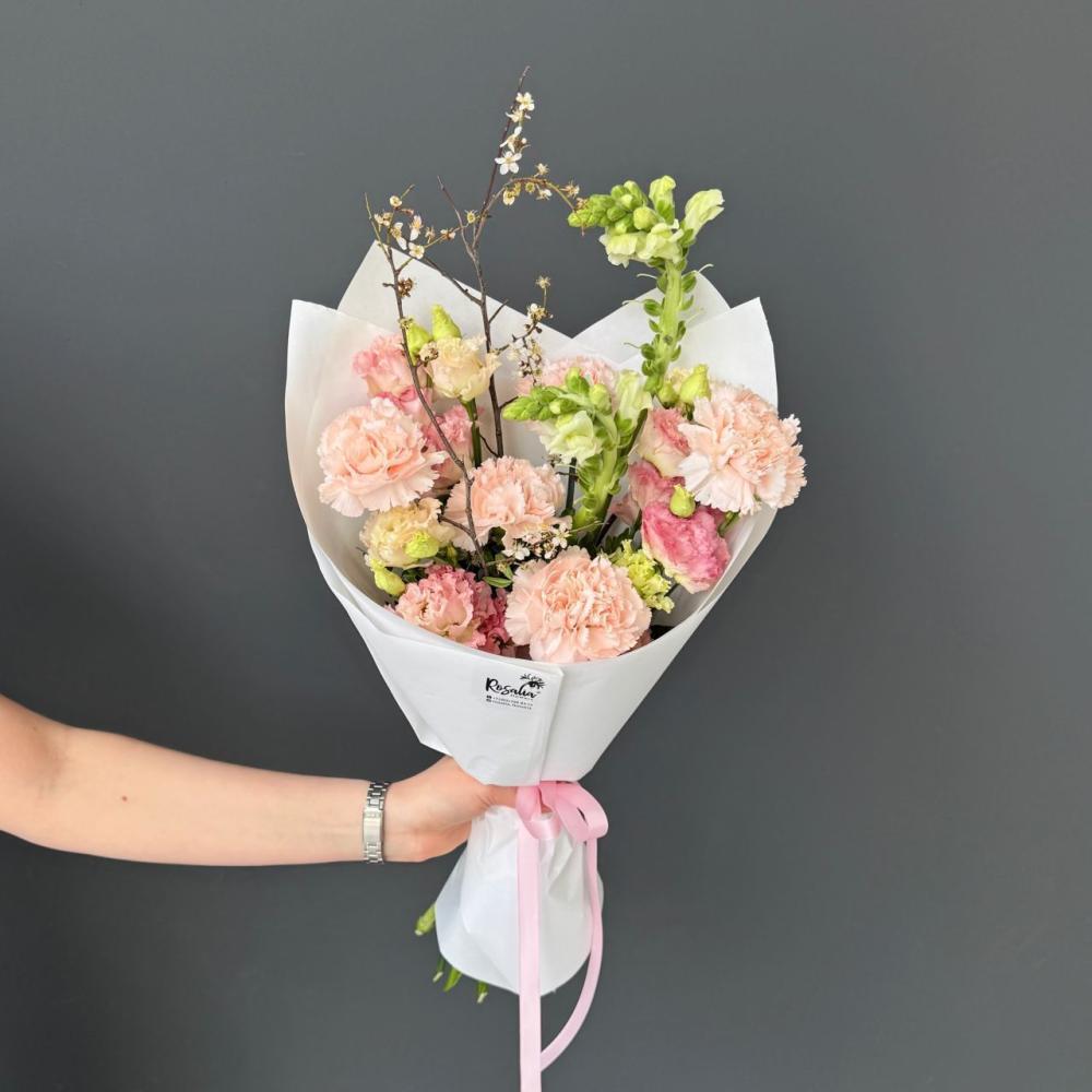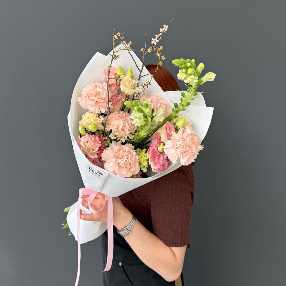 Нежный букет в розовых оттенках, в котором идеально сочетаются гвоздики, лизиантус и антир, а ветки задают интересную форму. Доставляется в транспортировочной коробке.
