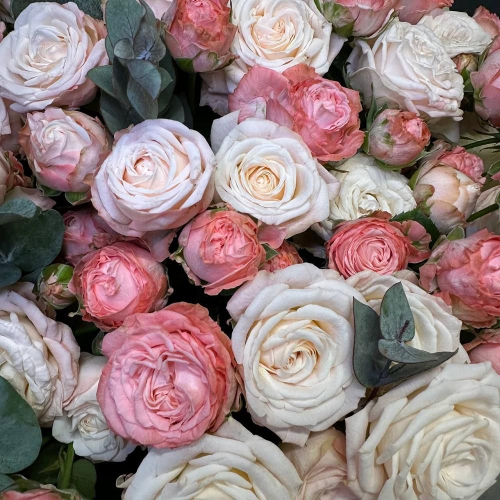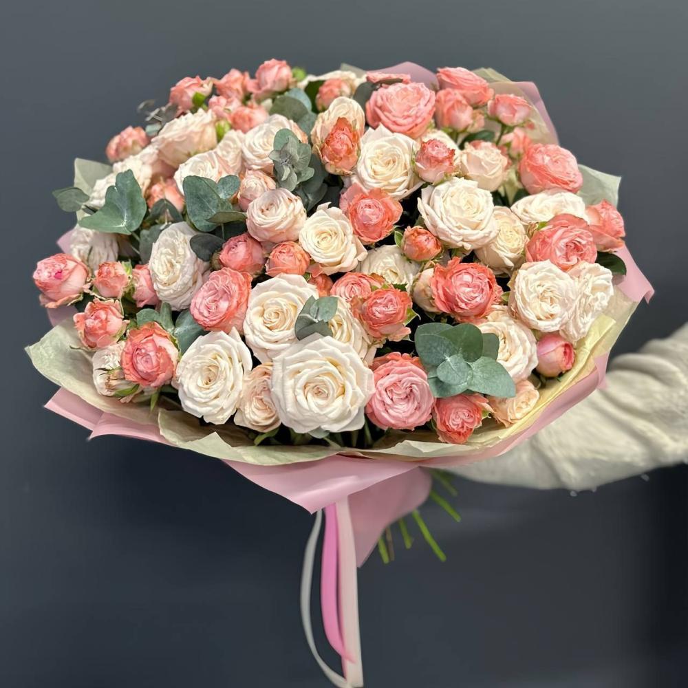 Букет из 19 кустовых пионовидных роз с добавлением эвкалипта Доставляется в транспортировочной коробке