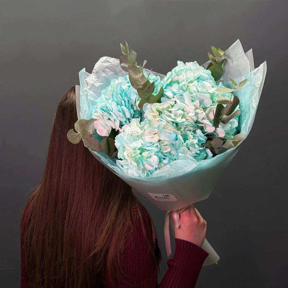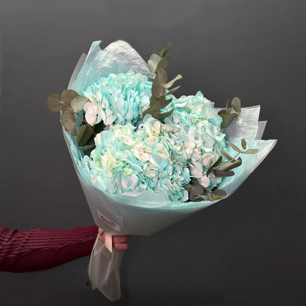 Монобукет из шикарной голубой гортензии с добавлением эвкалипта Доставляется в транспортировочной коробке