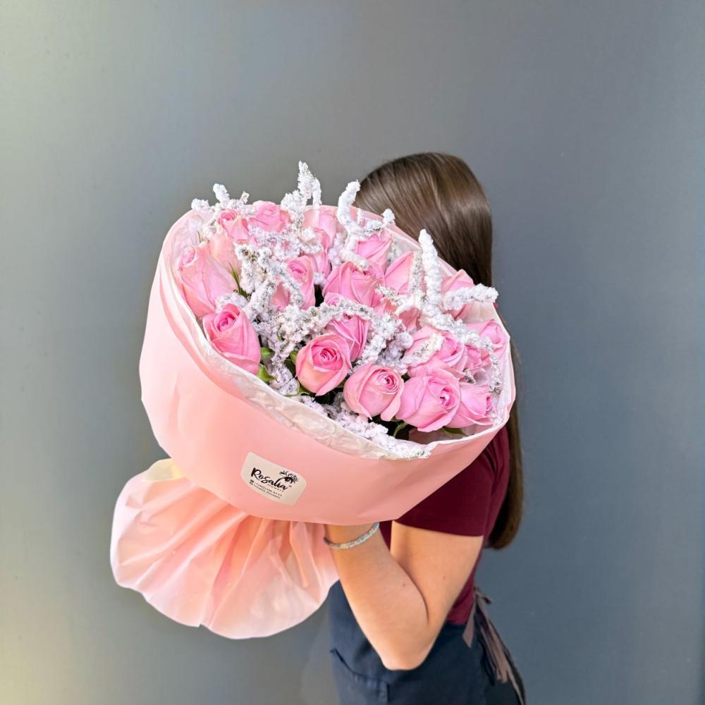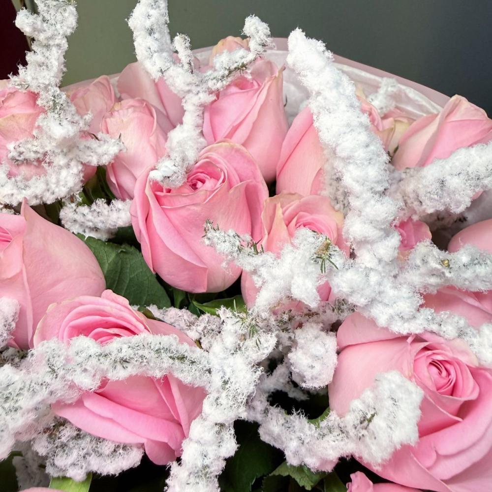 Зимняя нежность, подари красоту и уют близким Букет из кенийский розы с аспарагусом Доставляется в транспортировочной коробке