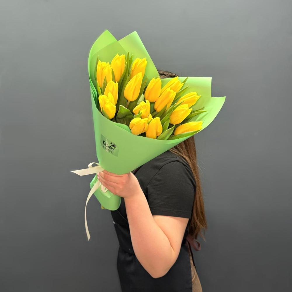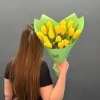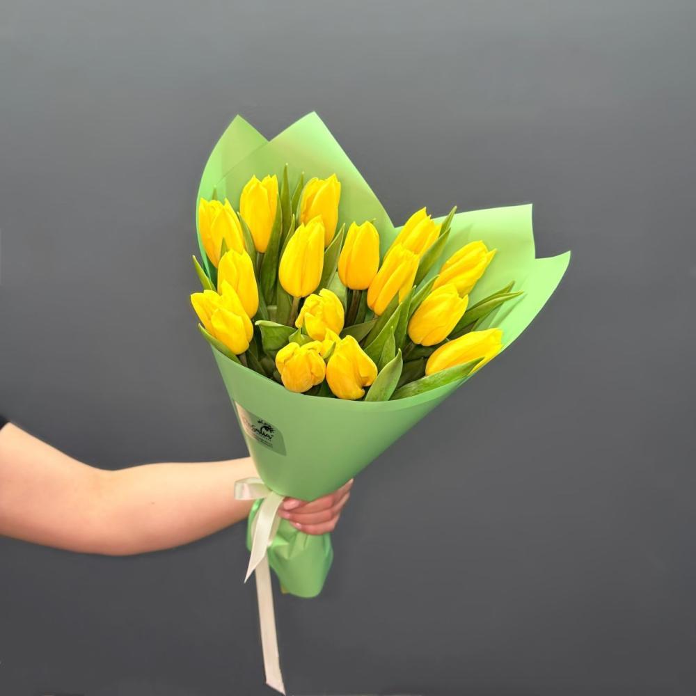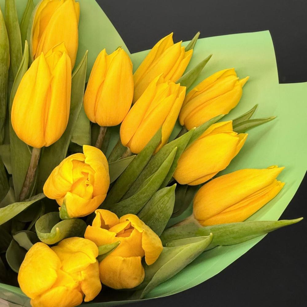 Яркий букет из 15 желтых тюльпанов. Доставляется в транспортировочной коробке