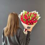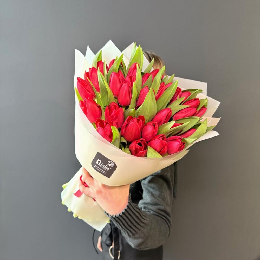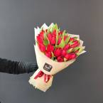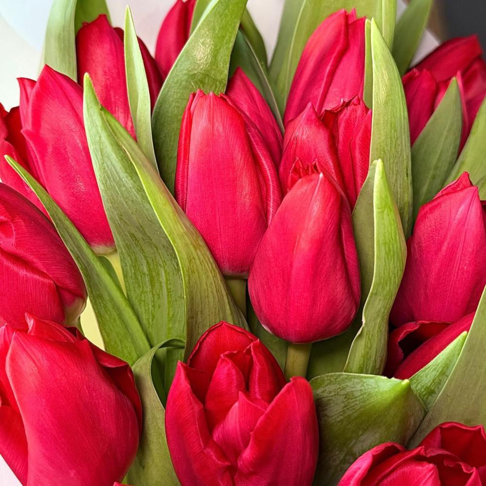 Яркий букет красных тюльпанов. В букете 35 штук. Доставляется в транспортировочной коробке.